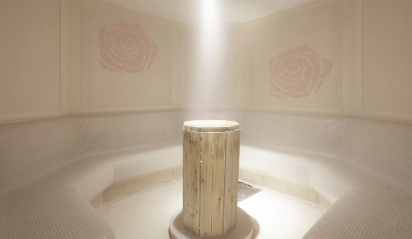 続いては、スチームもくもくのローズテルマリウム。塩とローズアロマを混ぜ合わせてできた、キュートなピンクソルトをたっぷり手に取って室内へ。