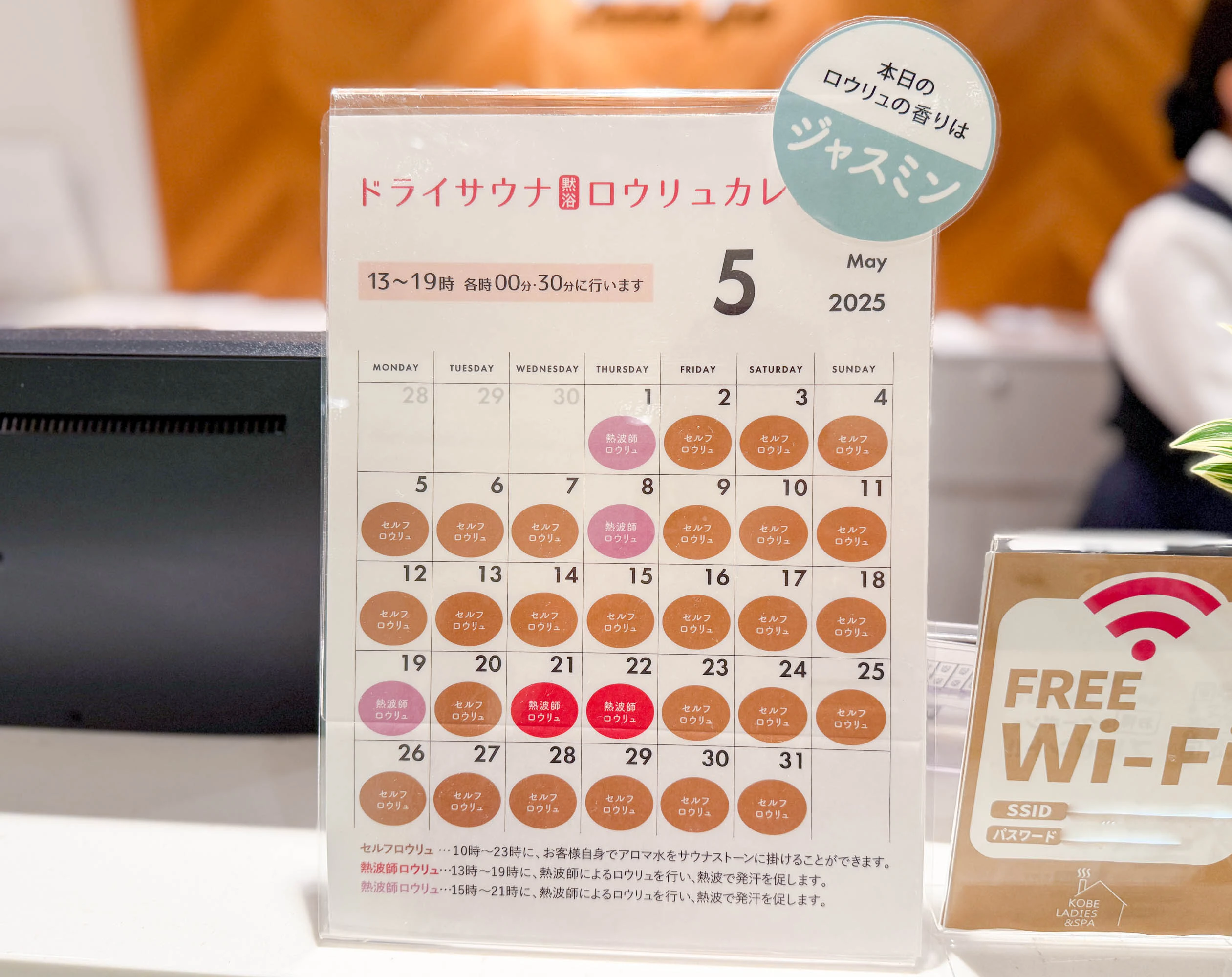 日によっては熱波師によるロウリュサービスが行われることもあるので、要チェック。この日は「セルフロウリュDAY」。ジャスミンのやさしい香りに癒されました。