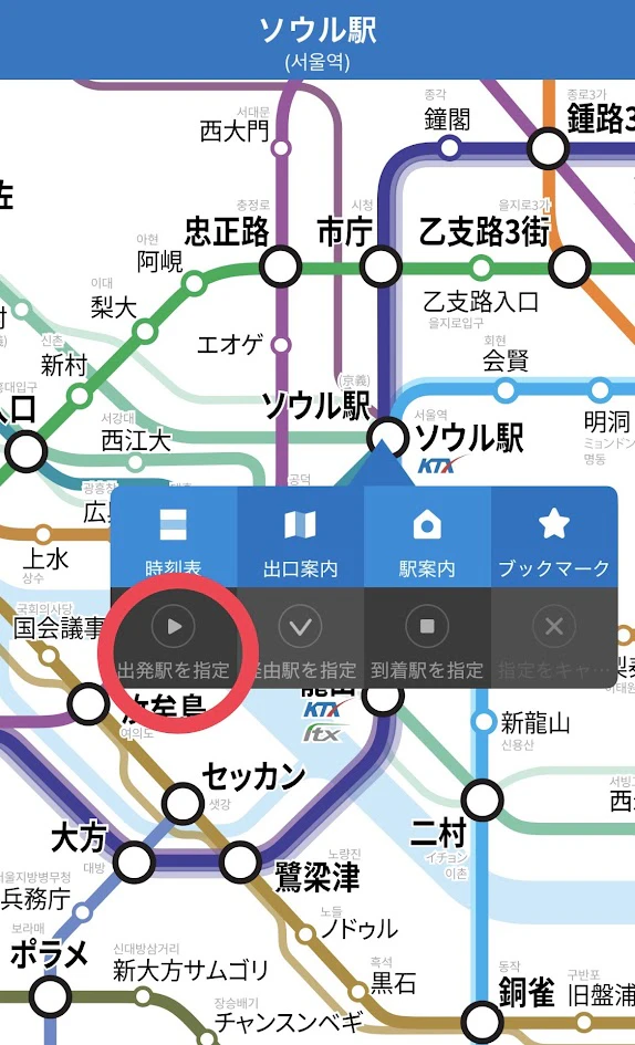 使い方は簡単。アプリ上で出発する駅をタップして「出発地を指定」を押します。