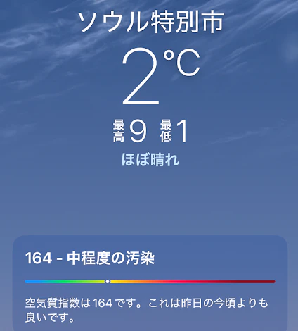 筆者が滞在した時期のソウルでは、数値が住んでいるエリア(神奈川県)の6倍高い日がありました。特に暖房を使う時期は数値が上がりやすいそうなので、マスクを常備することをおすすめします。