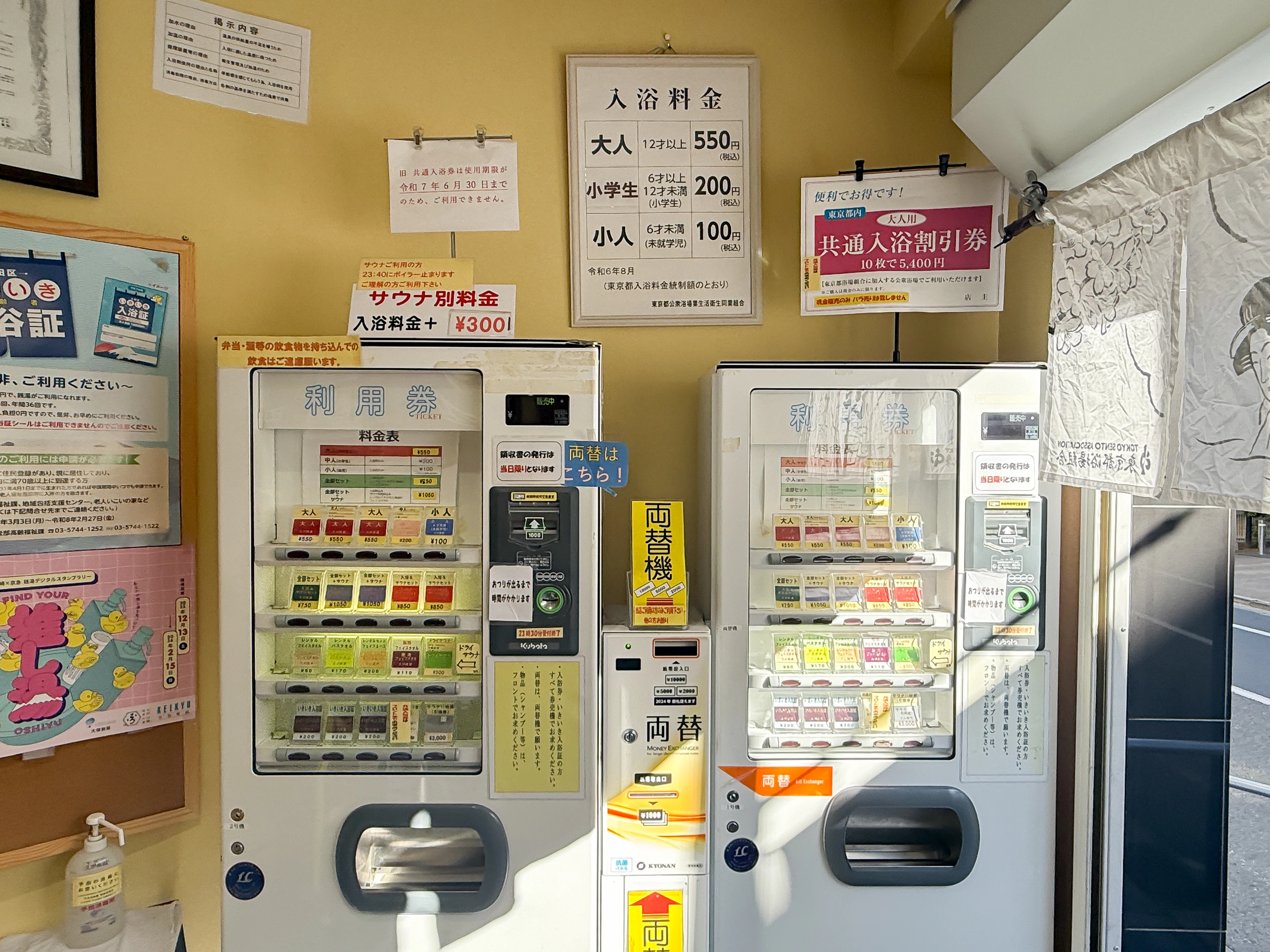 暖簾をくぐると券売機があるので、「全部セット」(入浴+タオルセット)とサウナの利用券を購入し、さっそく中へ。