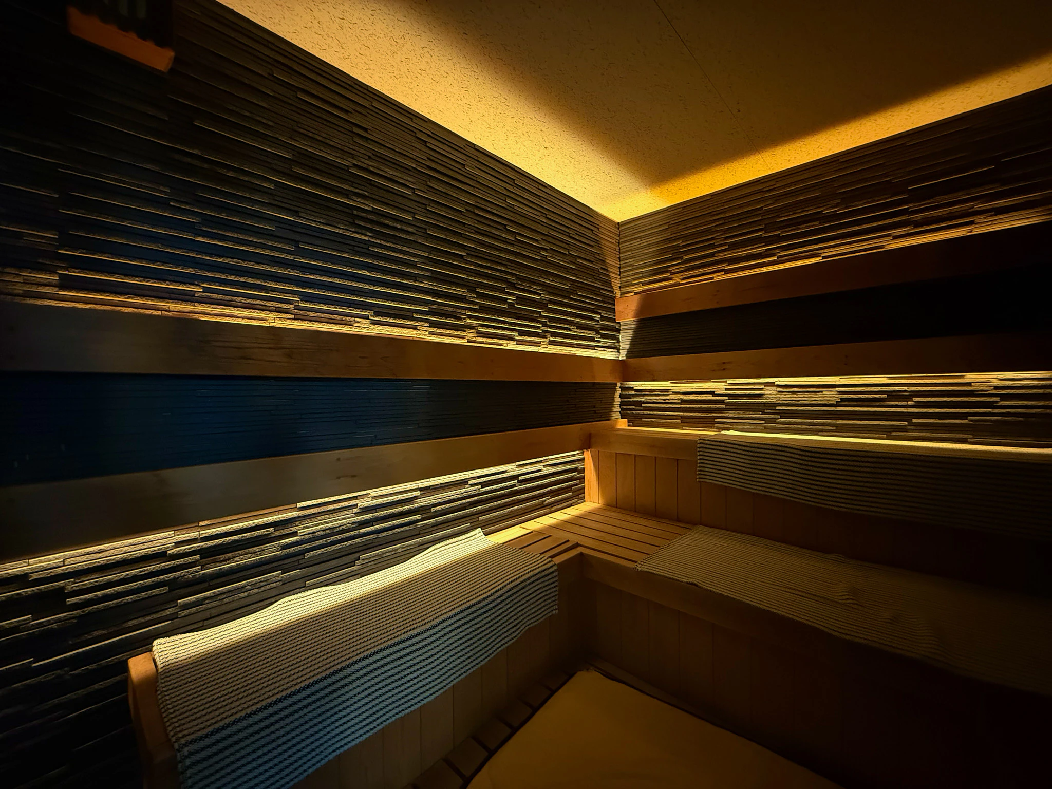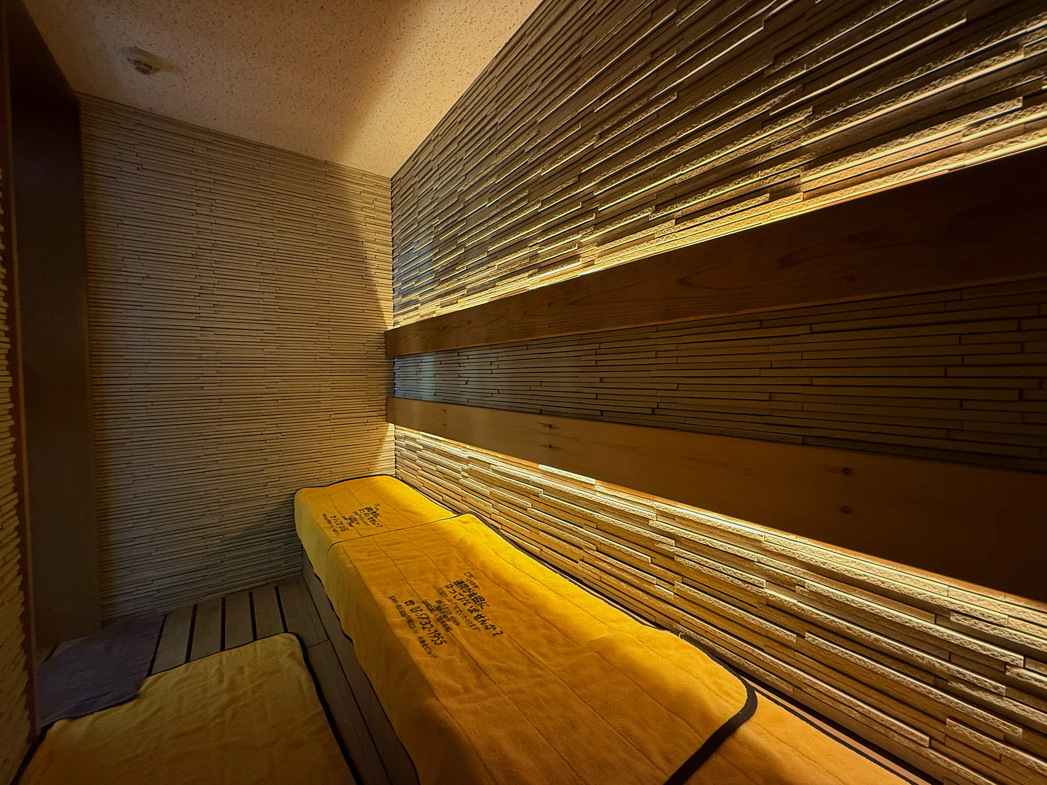 照明が少し落ち着いた室内は、サウナに集中するのにもってこいの空間。明るい浴室とは対照的な雰囲気もいい!