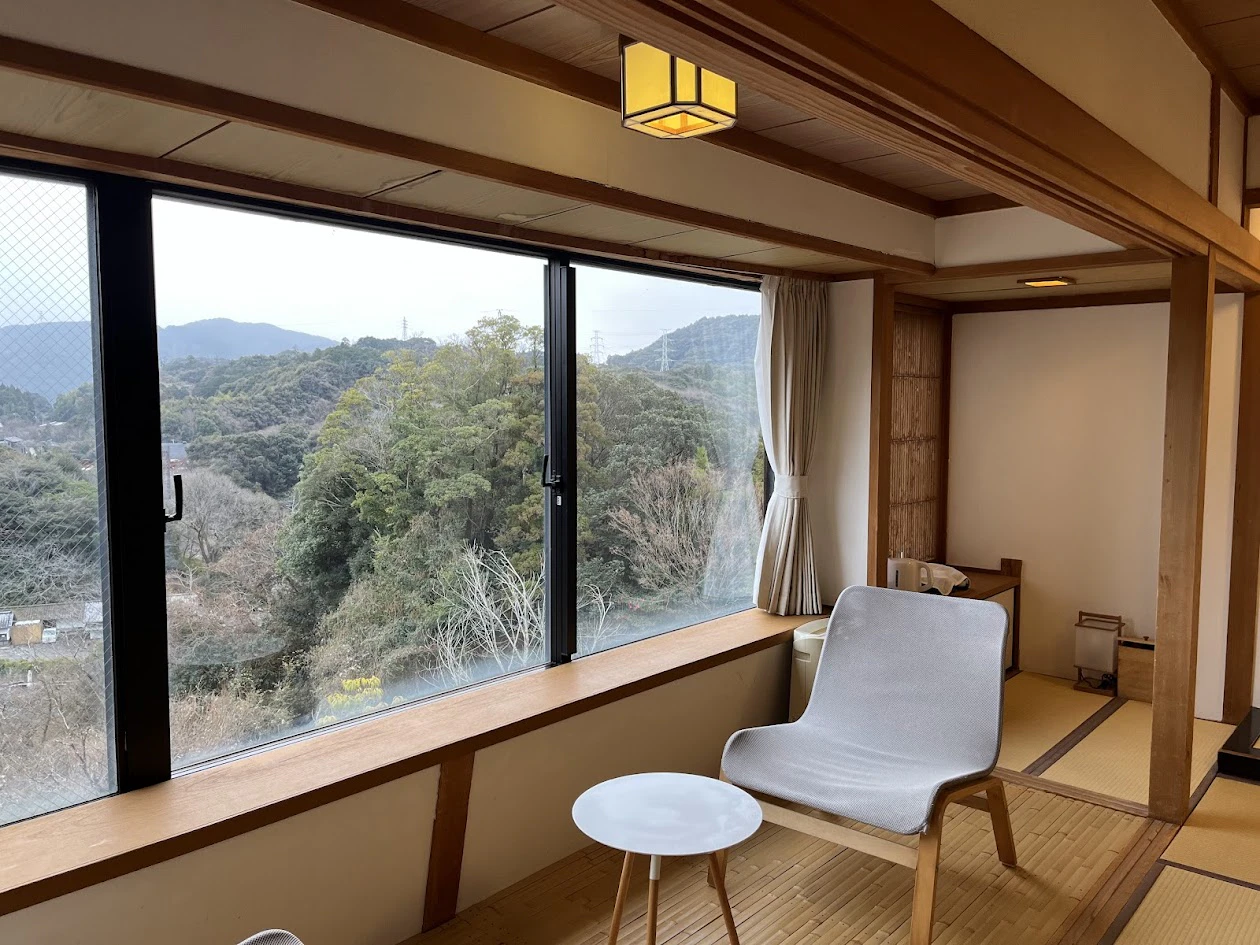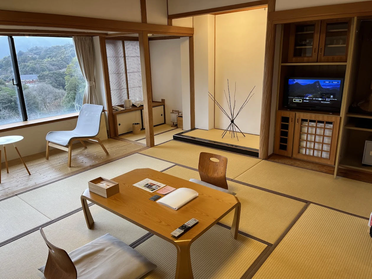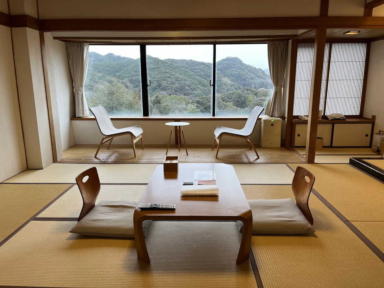 続いてお部屋へ。御船山楽園ホテル本館の客室には、日本の地名が名付けられています。今回私たちが宿泊したのは「佐渡」。大きな窓から御船山の豊かな自然が見渡せる、凛とした佇まいの和室です。
