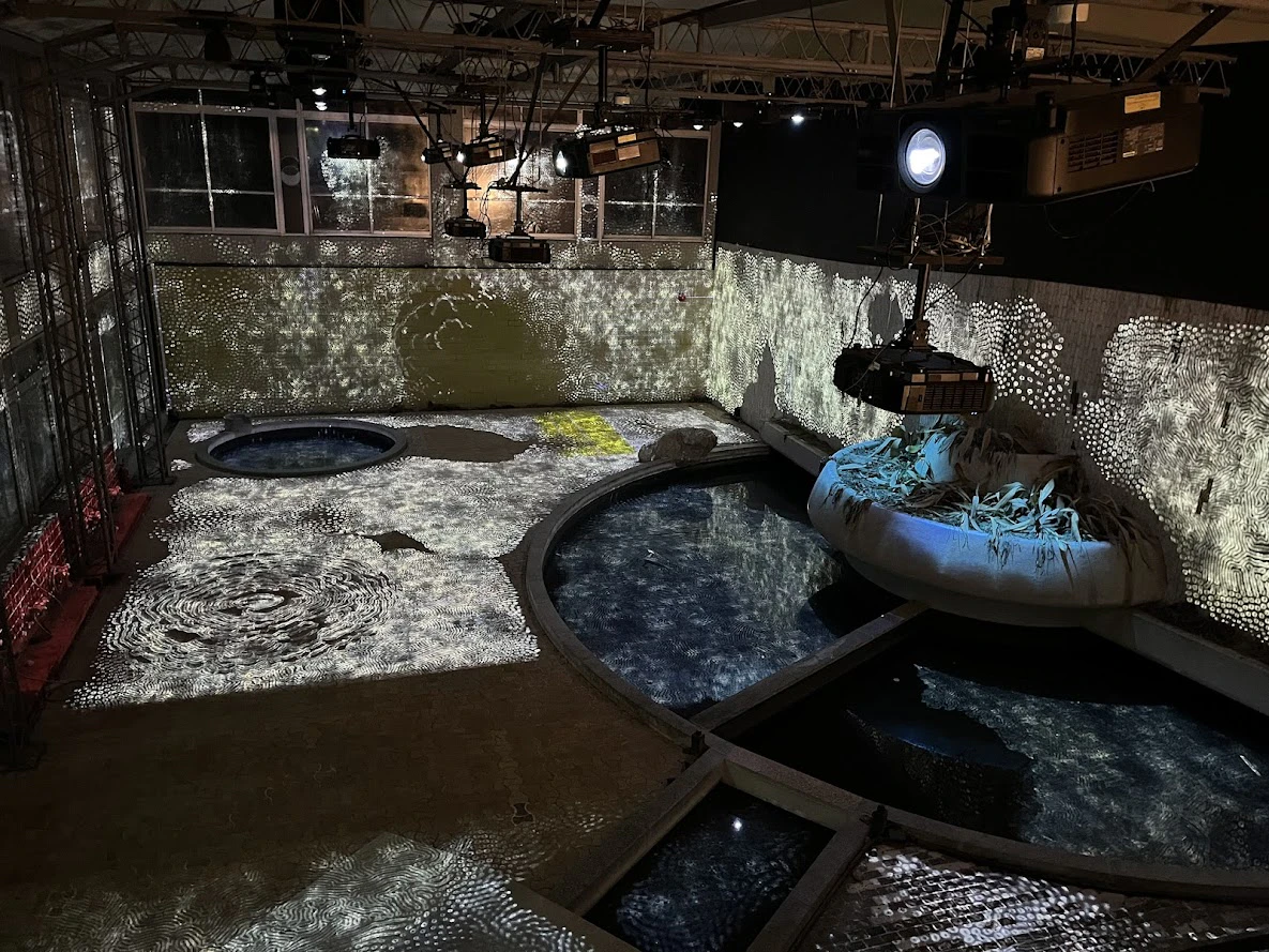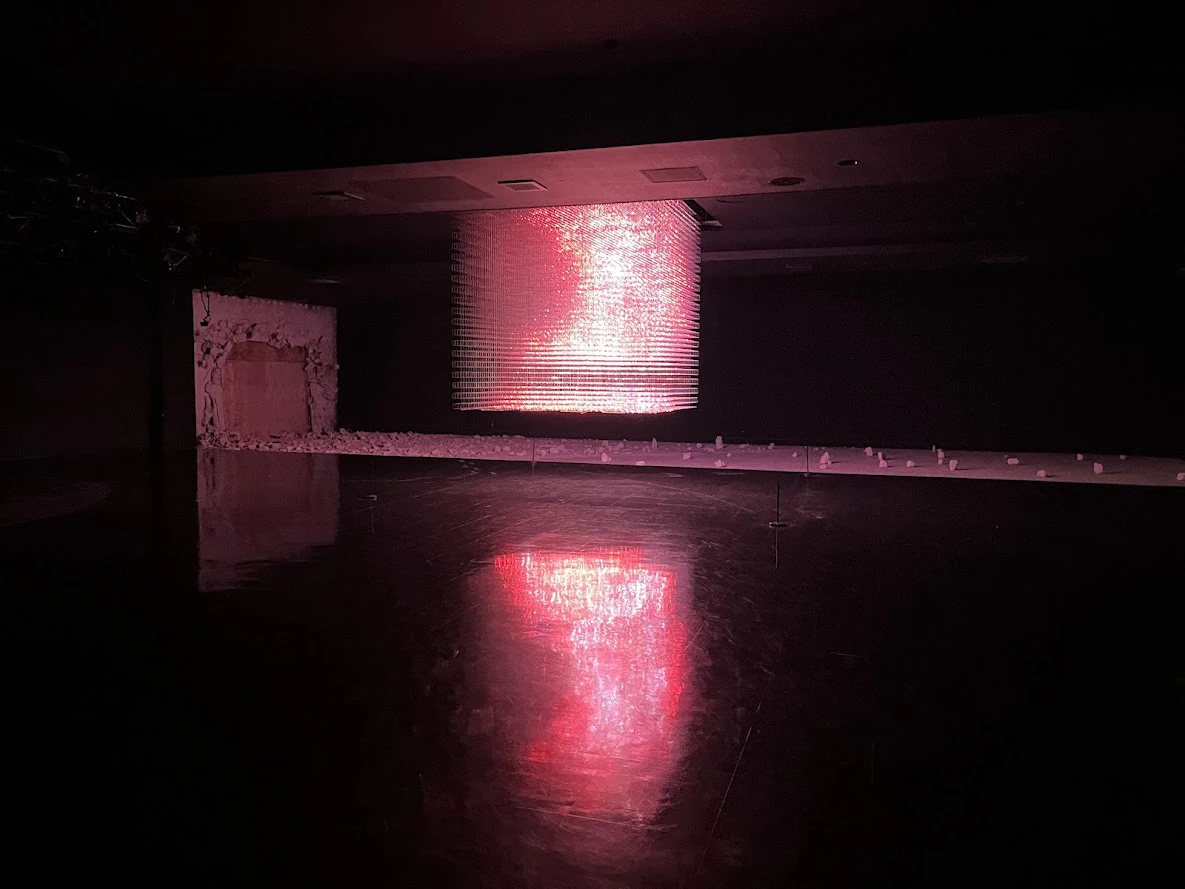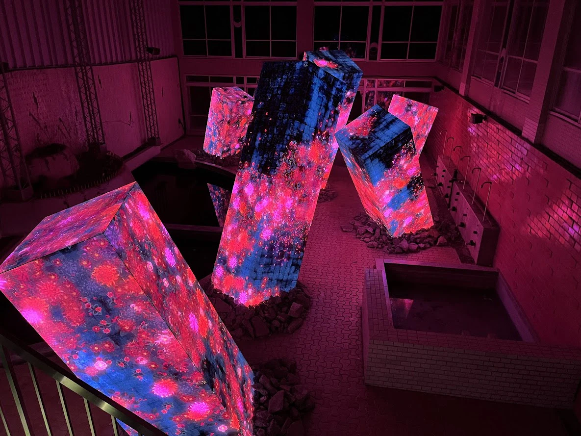 宿の廃墟となった部分をアレンジした空間。昔お風呂だった場所がキラキラと宇宙のようにきらめき、巨大な柱は幻想的かつヴィヴィッドな光を放っています。