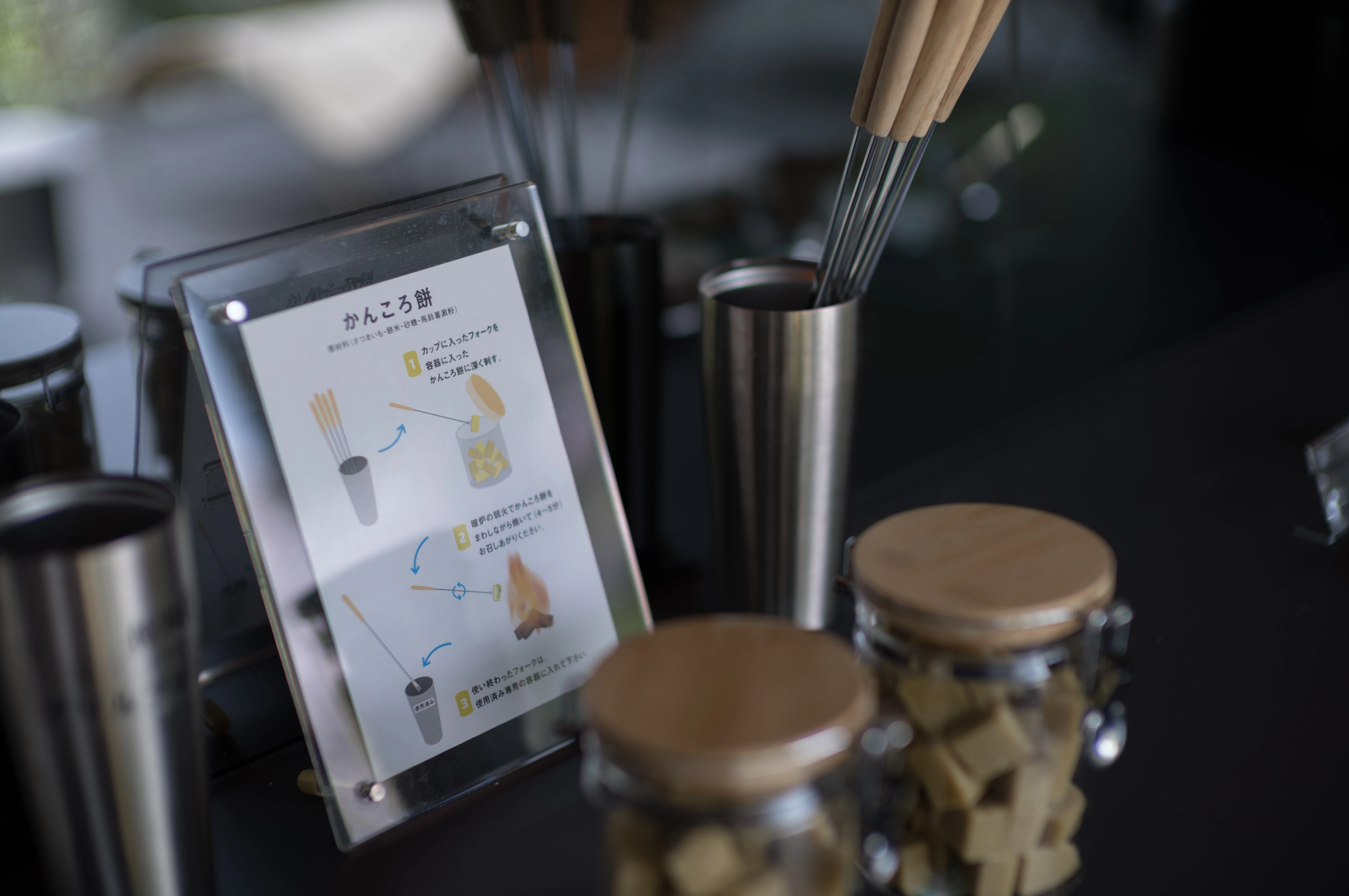 お菓子は女性側とほぼ同じですが、唯一違うのは、玉羊羹の代わりにかんころ餅があること。しかも焚き火にかざして自分で焼くスタイルなんです。焼きたてを食べられるという贅沢…!2日目になっても楽しみは尽きません。