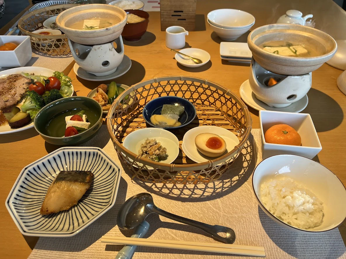 締めくくりはビュッフェ形式の朝ごはん。ローストポークや湯豆腐、刺身こんにゃくなど、朝の胃腸にやさしいメニューが並びます。