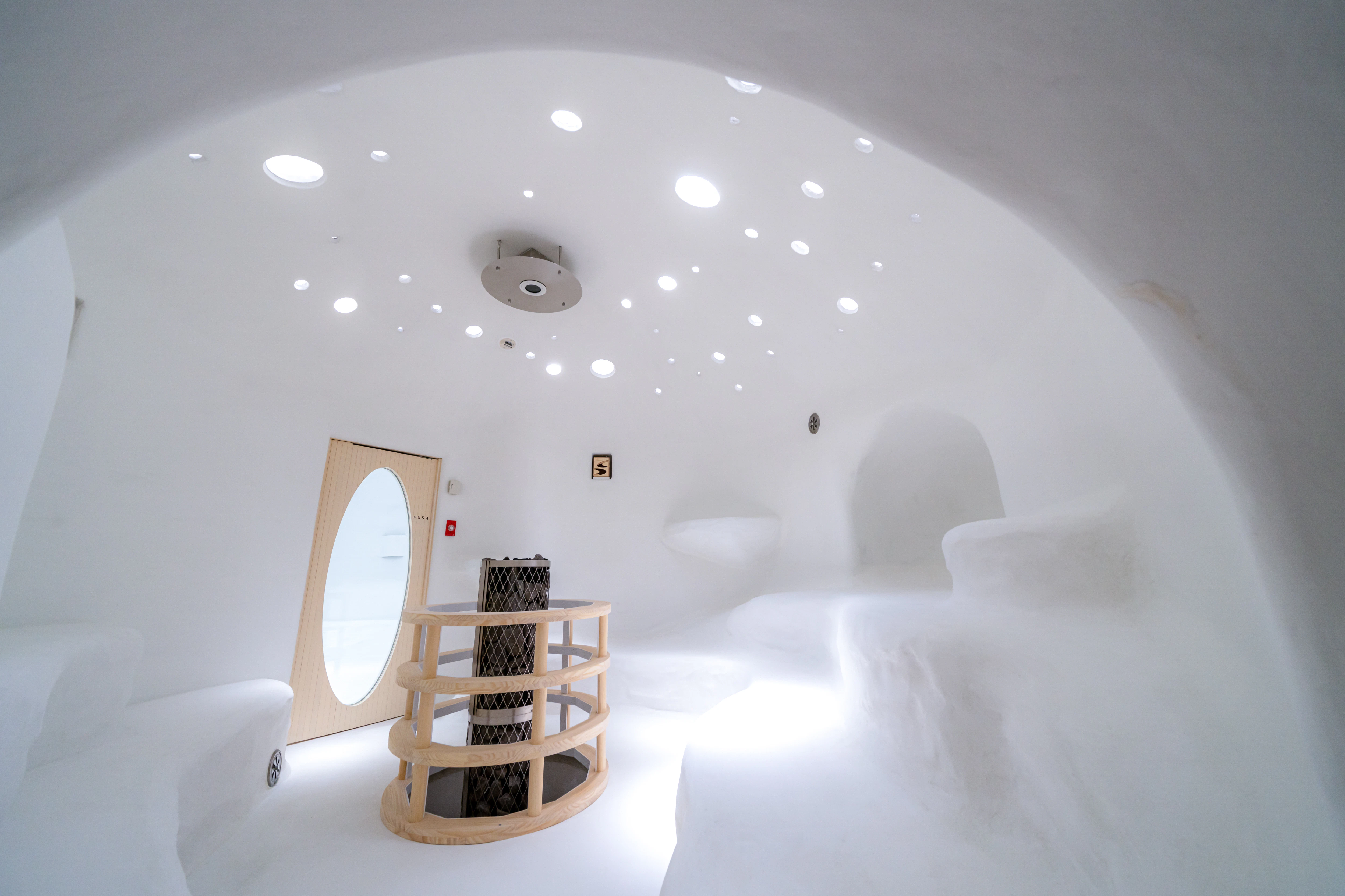 そして、らかんの湯の代名詞ともいえるのが、この「白い洞窟サウナ(メディテーションサウナ)」。 一見すると入り口が分かりにくい隠れ家のような造りで、見逃してしまうところでした。危ない危ない…!