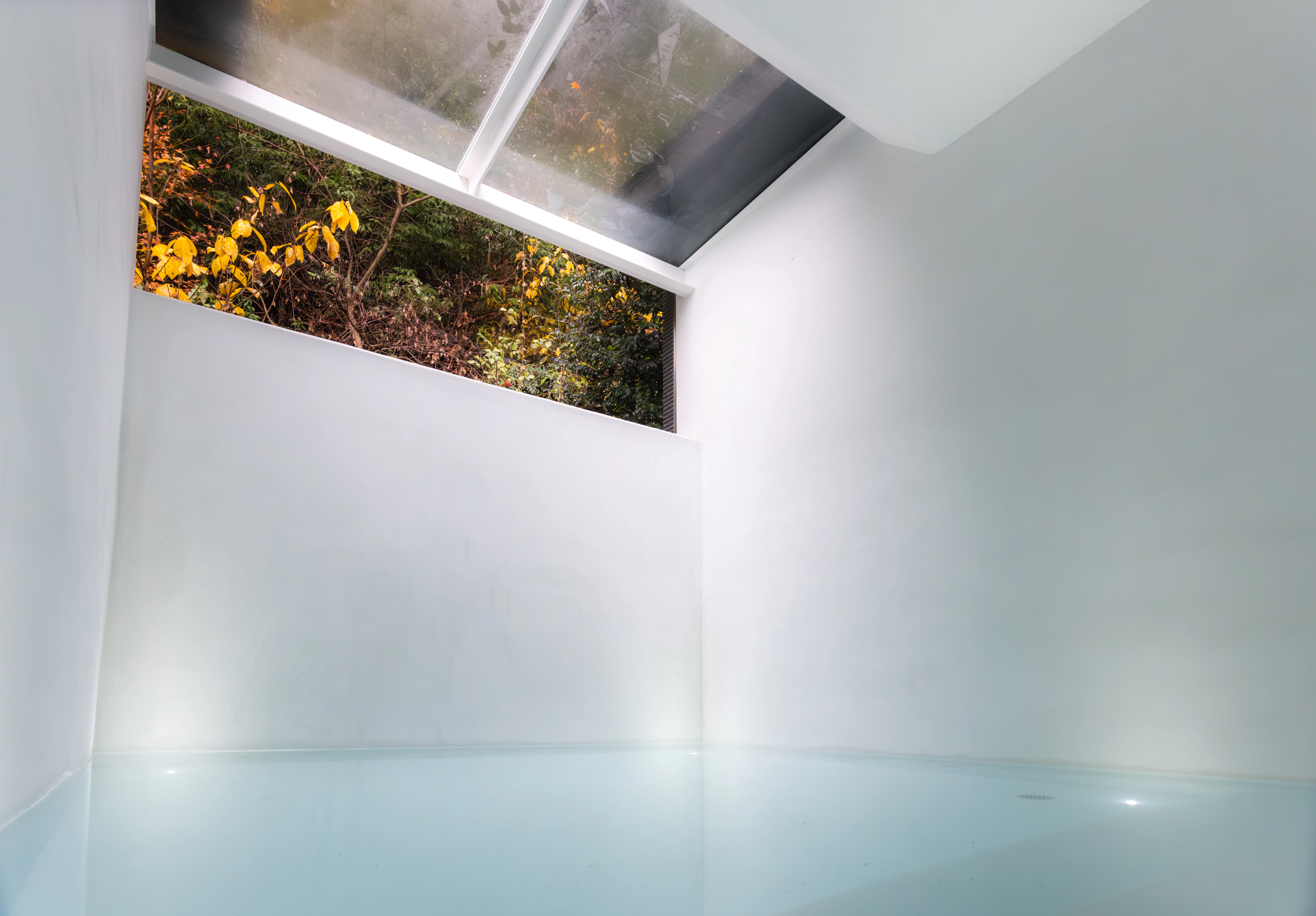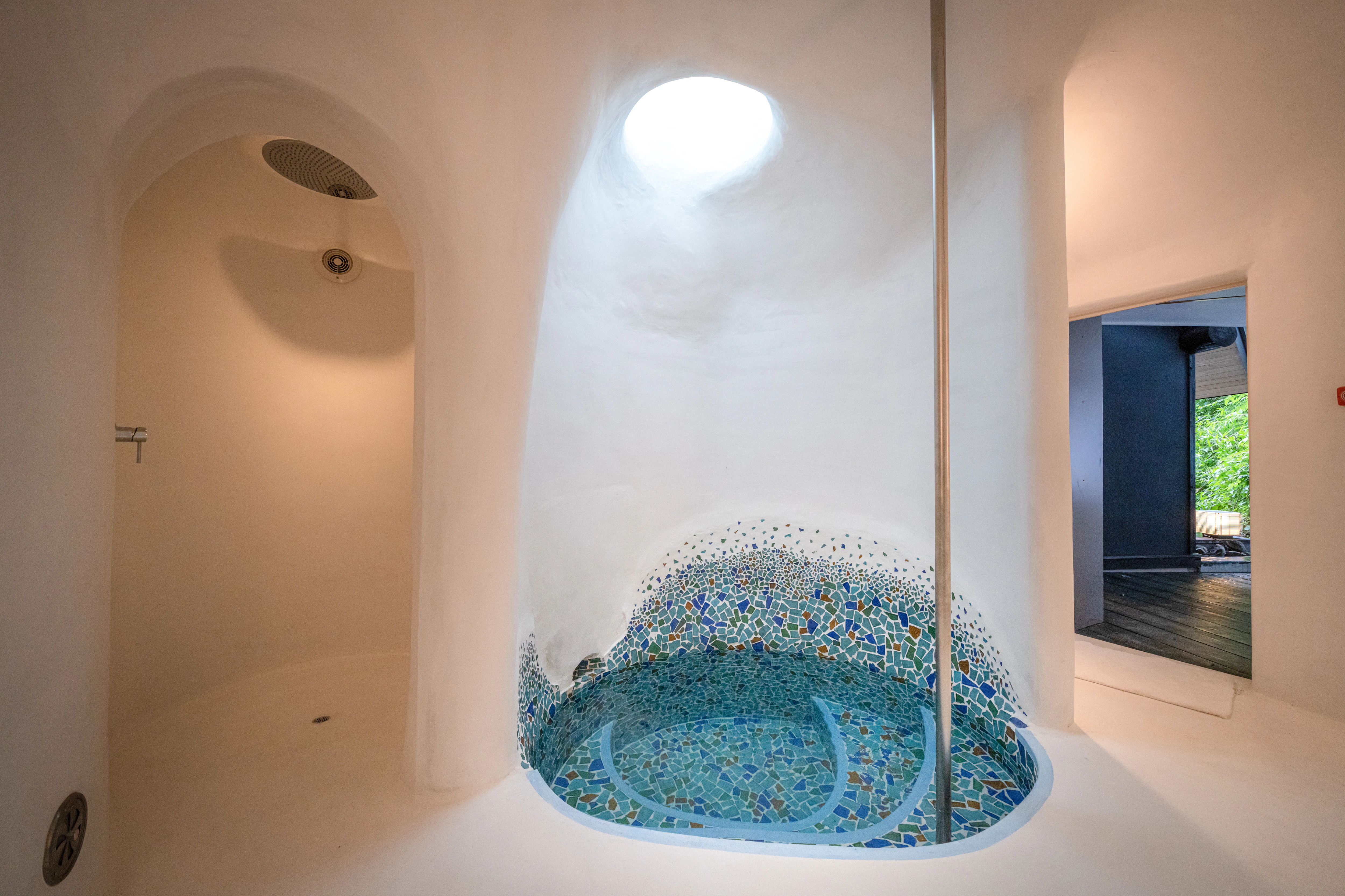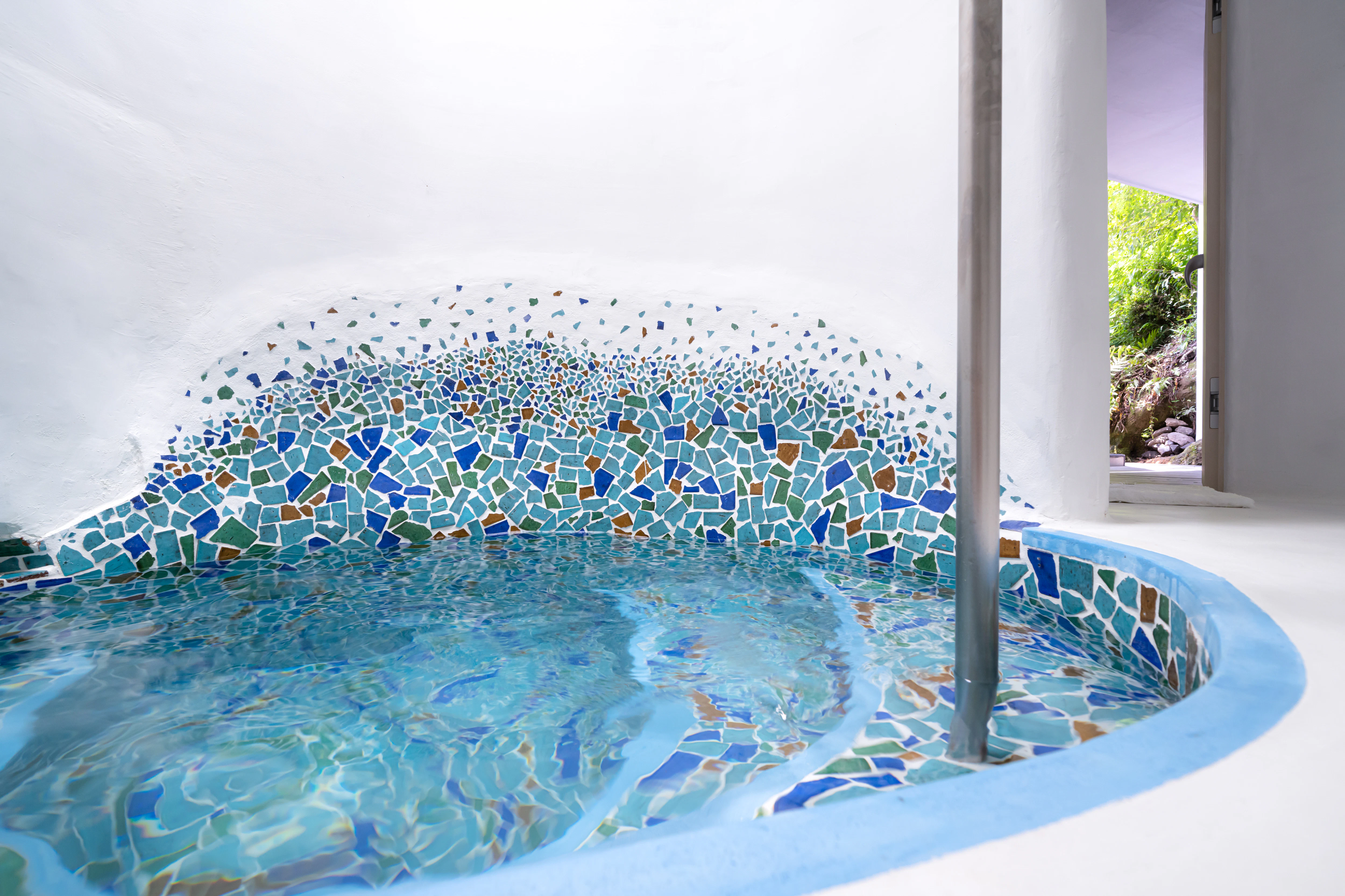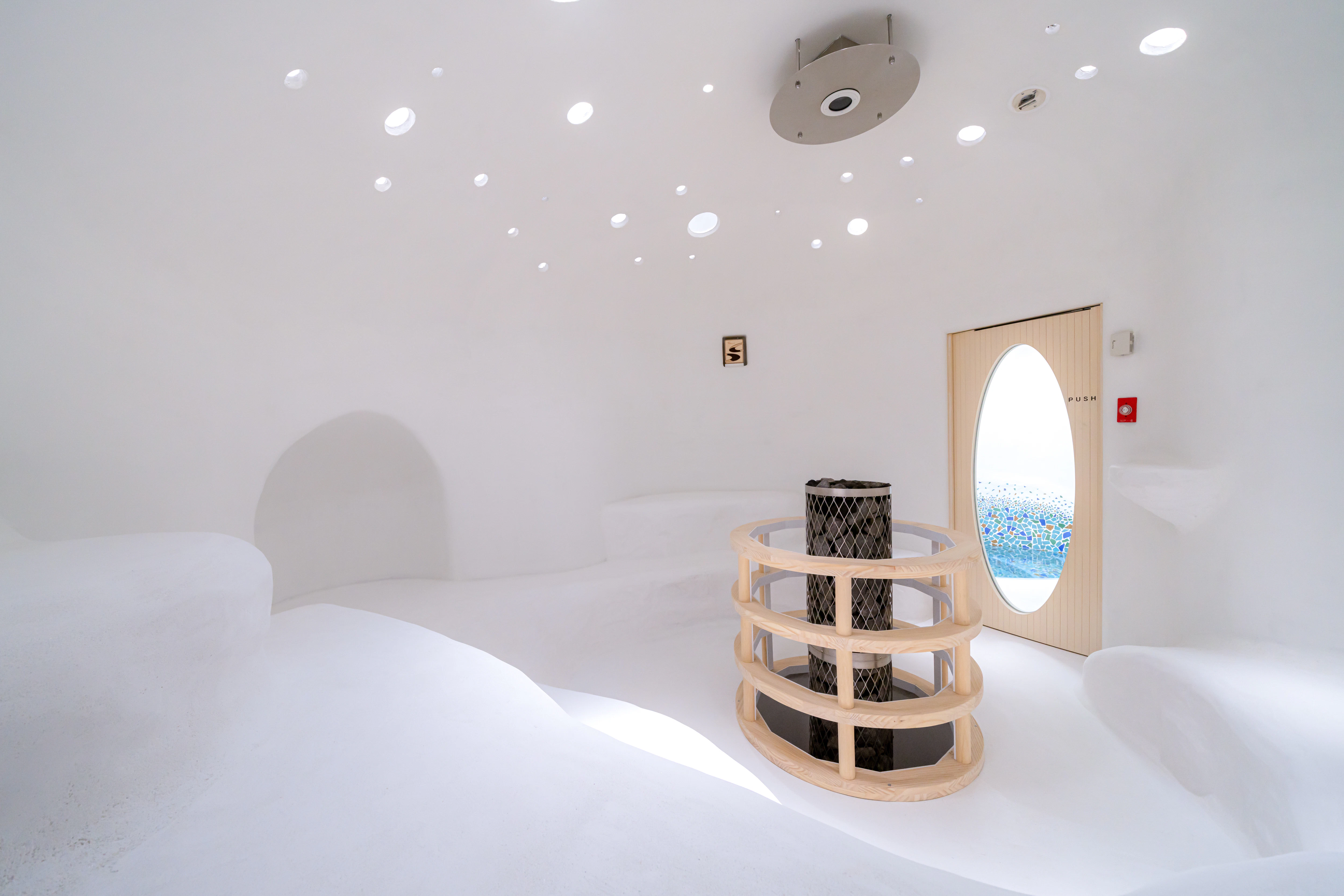 薬草スチームサウナから外に出ると、目の前には真っ白な水風呂。まるでギリシャ・サントリーニ島の一角のよう。神聖な気持ちになりつつ、火照った体を静かに鎮めます。