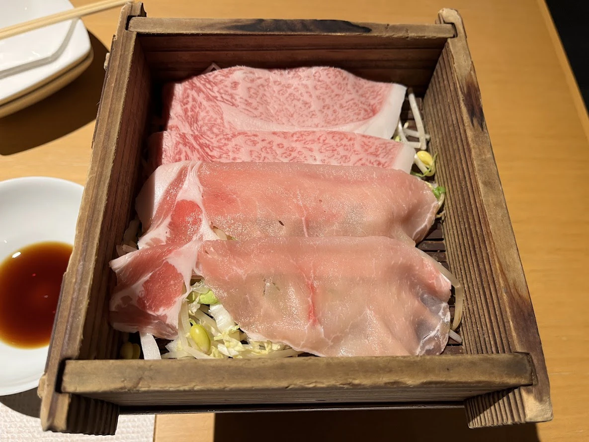 お風呂をひとしきり満喫したあとは夕食の時間。「季節のおまかせ会席スタンダード」をいただきました。地産地消のメニューで、A5ランク等級の佐賀牛、楽園なべ、白身魚のパイ包みなど。せいろで蒸したお肉を、ナスのナムルと一緒にいただきました。