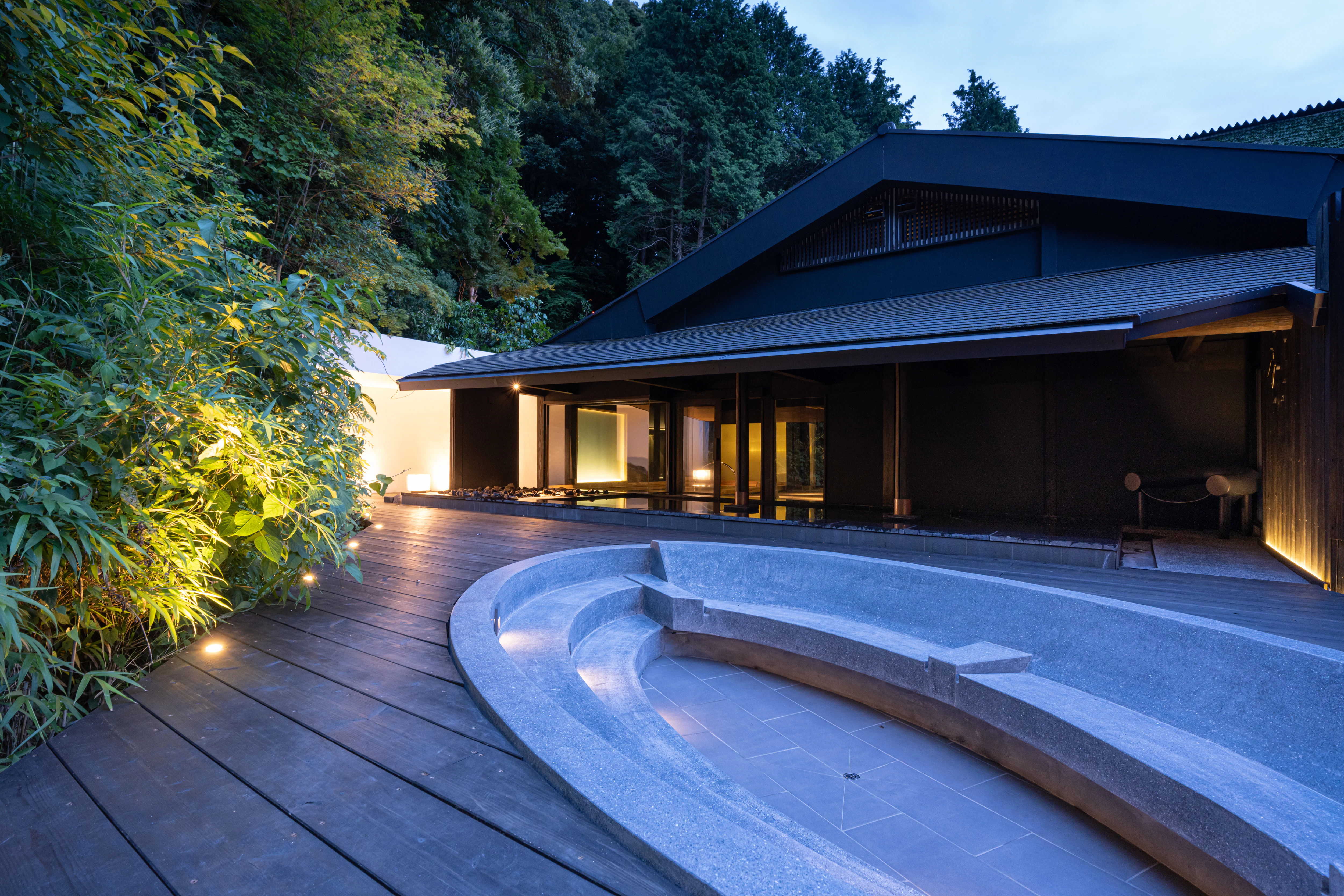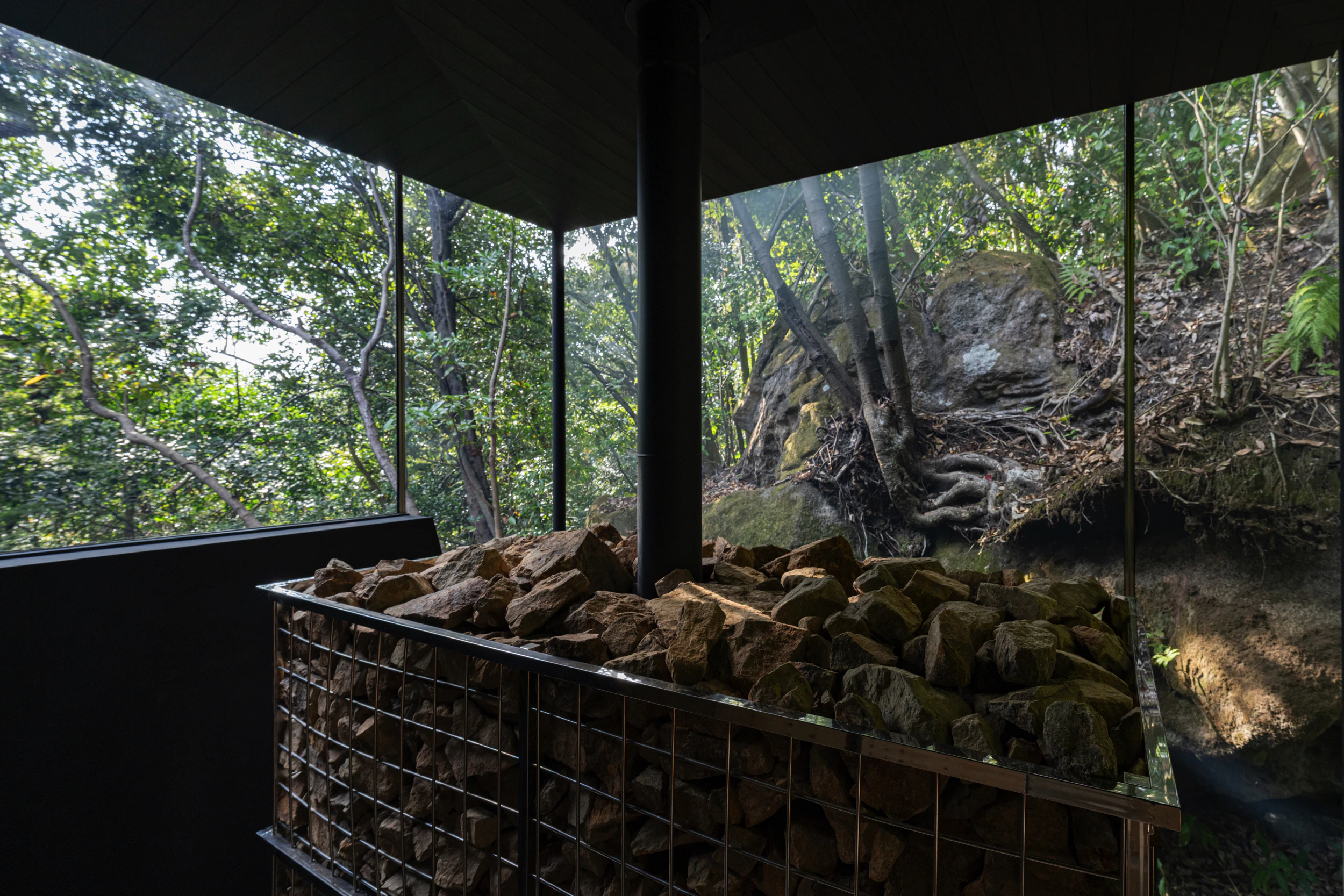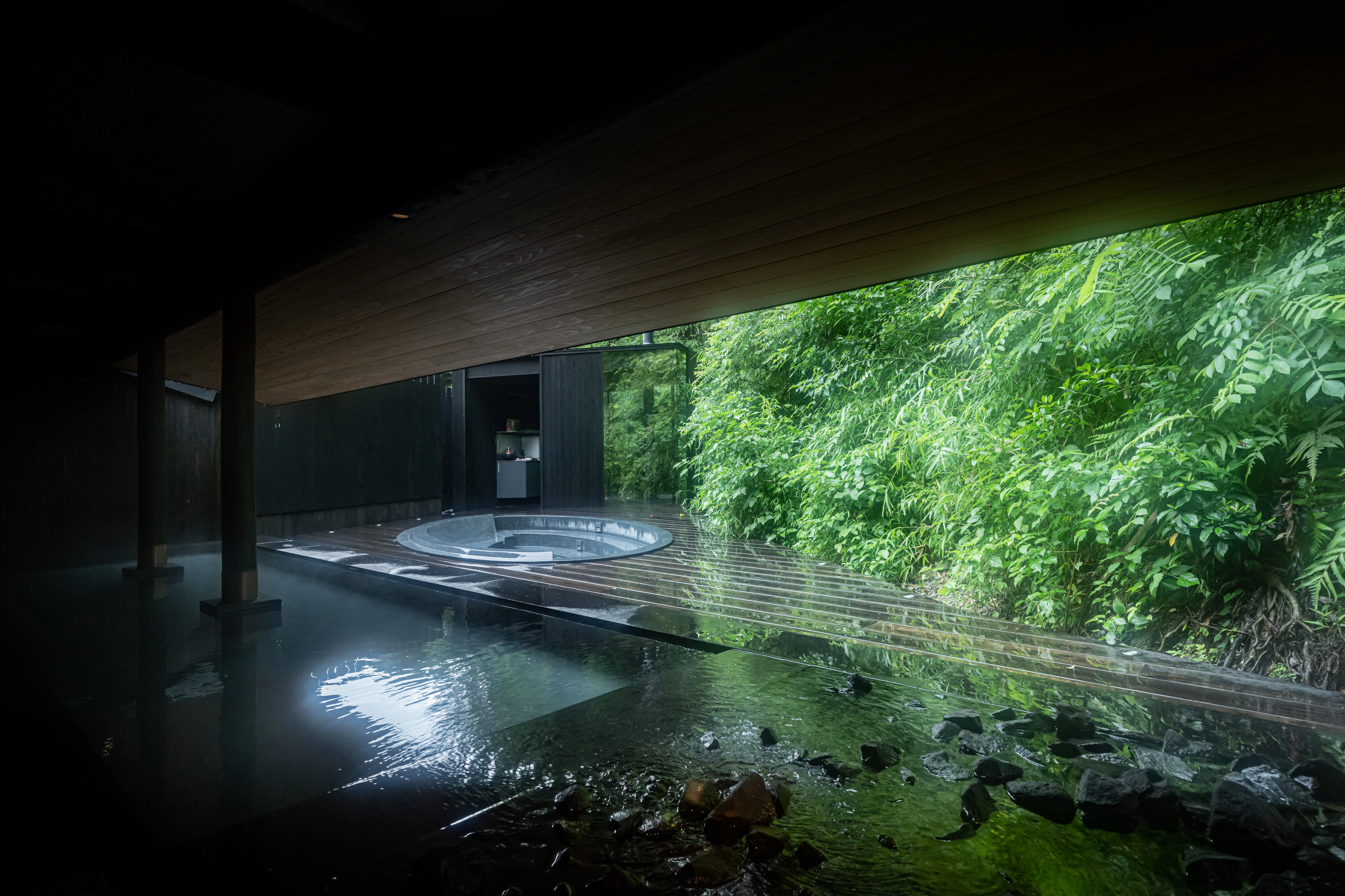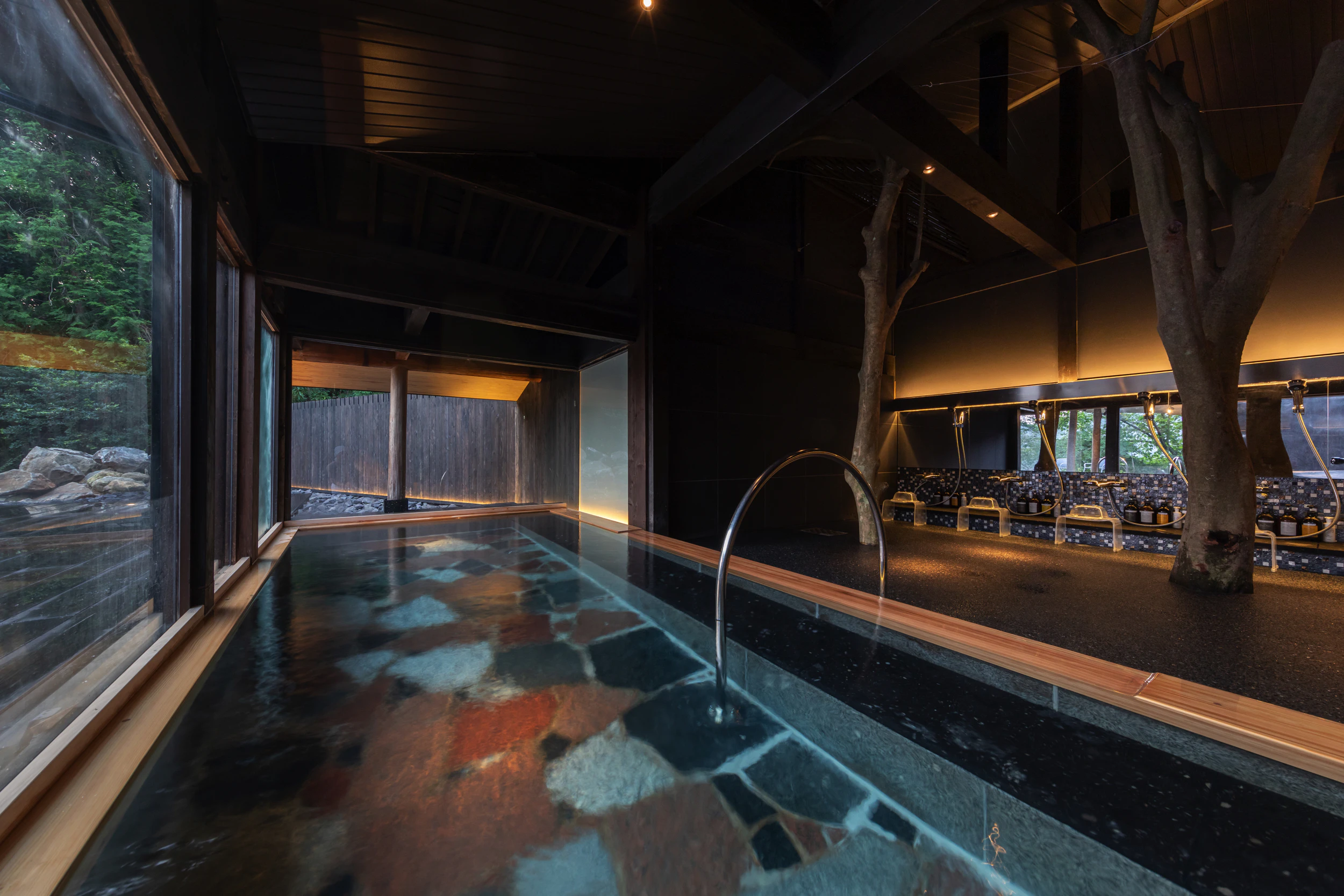 脱衣所を抜け、いざ浴場へ。 そこは黒を基調とした、静謐で落ち着きのある空間でした。驚いたのは、建物の中に本物の木が生えていること!入り口からすでに、らかんの湯ならではの圧倒的なこだわりが伝わってきます。