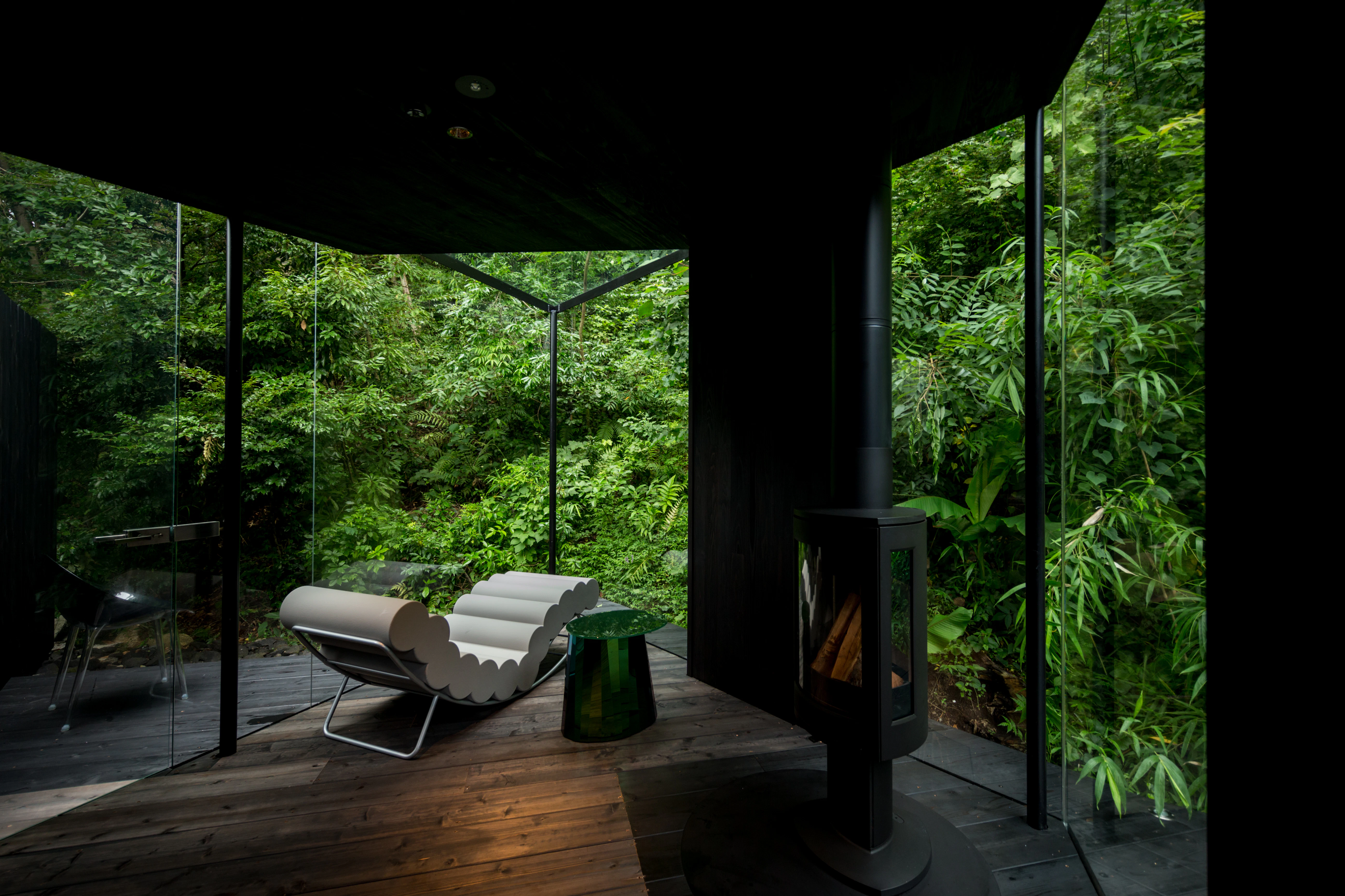 部屋の中には薪ストーブや蝋燭の火がゆらめいています。サウナの後にここでととのう時間は、空間にとけていくような感覚でした…。