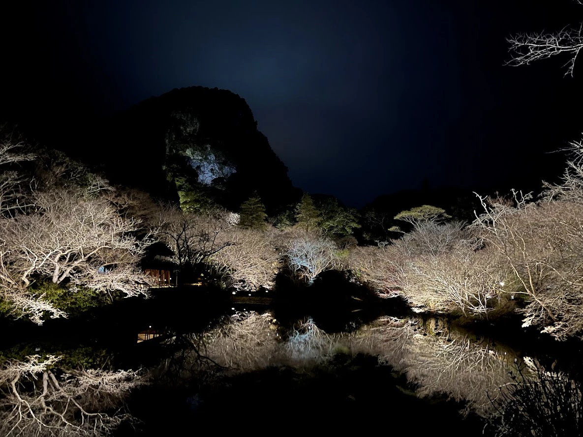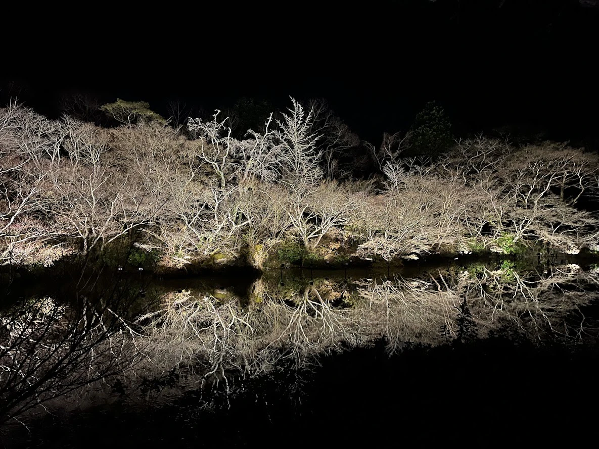 その後は、隣にある庭園を歩きました。宿泊者は無料で入れるのだそう。水面に映し出される木々のシンメトリーは、まさに絶景。想像以上の広さと、見事なライトアップに圧倒されました。