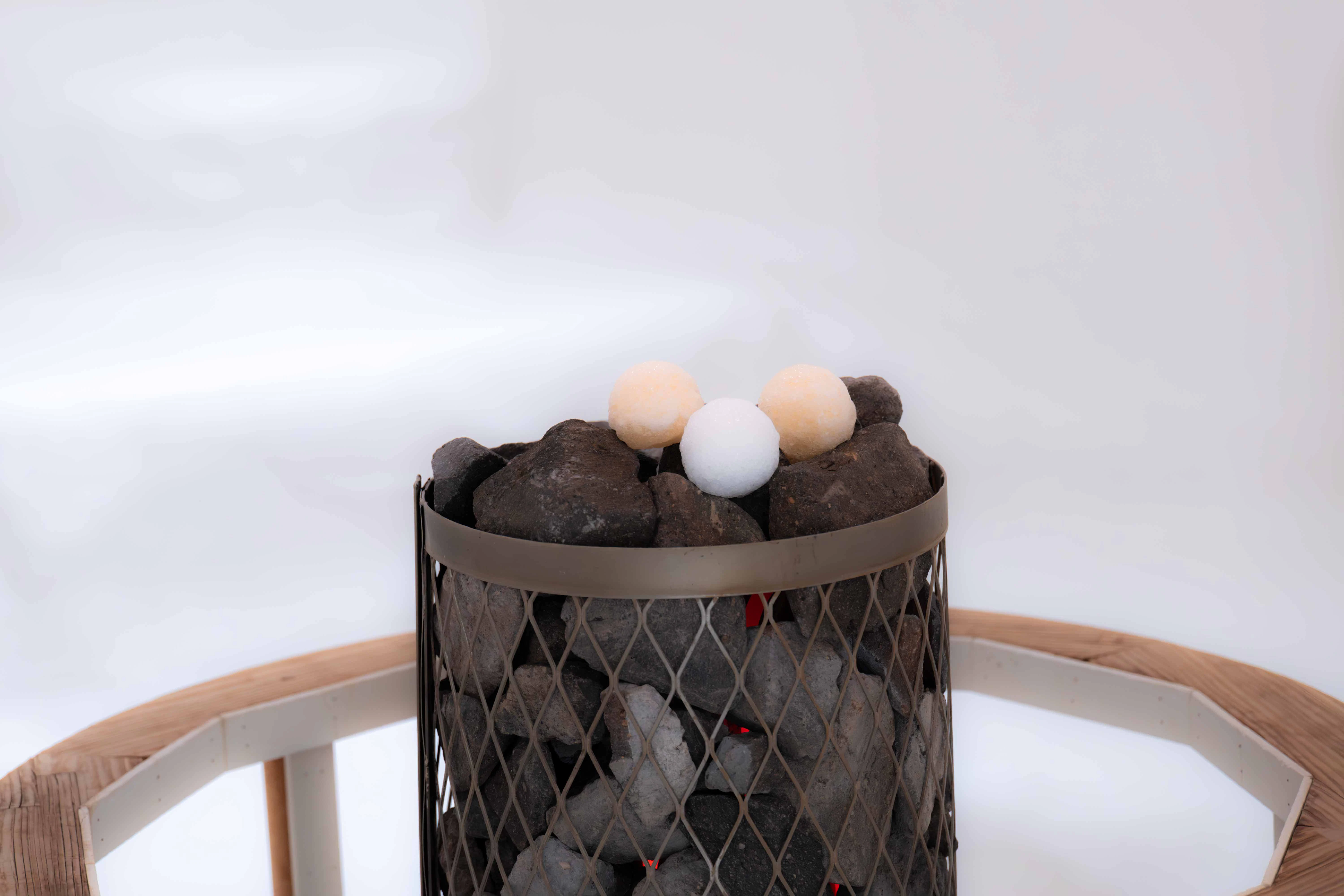 「キューゲル」と呼ばれる、アロマを閉じ込めた氷のボールをサウナストーンに乗せて楽しみます。この日のアロマは、みかんとハッカの2種類でした。