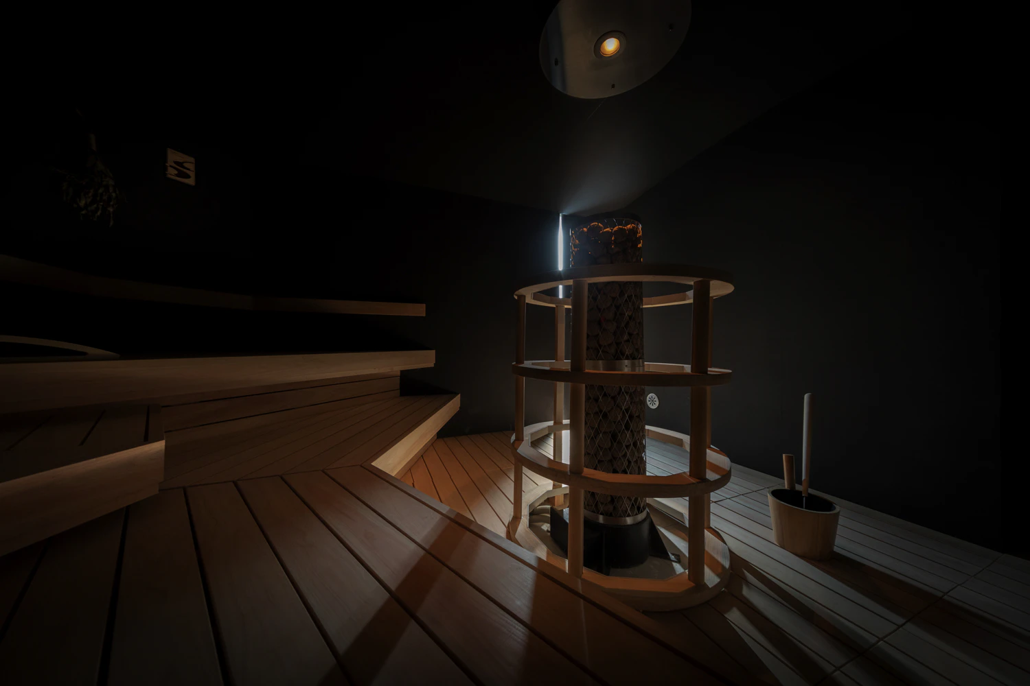 一番奥には、存在感のある薪サウナ。 扉を開けると階段があり、上へ行くほど熱気が増していきます。このサウナ、実は壁一枚を隔てて男女が同じ空間を共有しているという珍しい構造なんです。ストーブとちょっと距離がありますが、セルフロウリュも可能です。