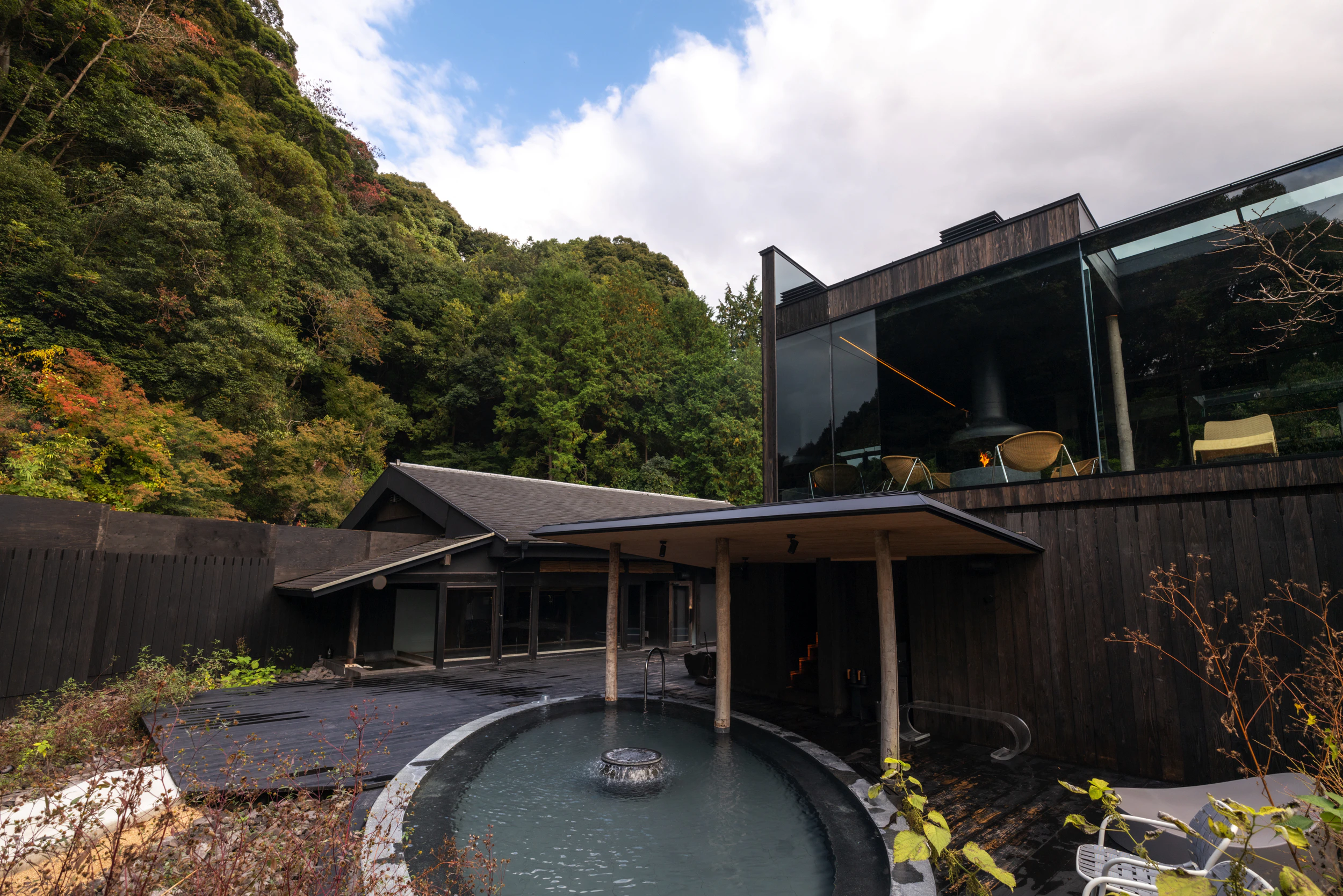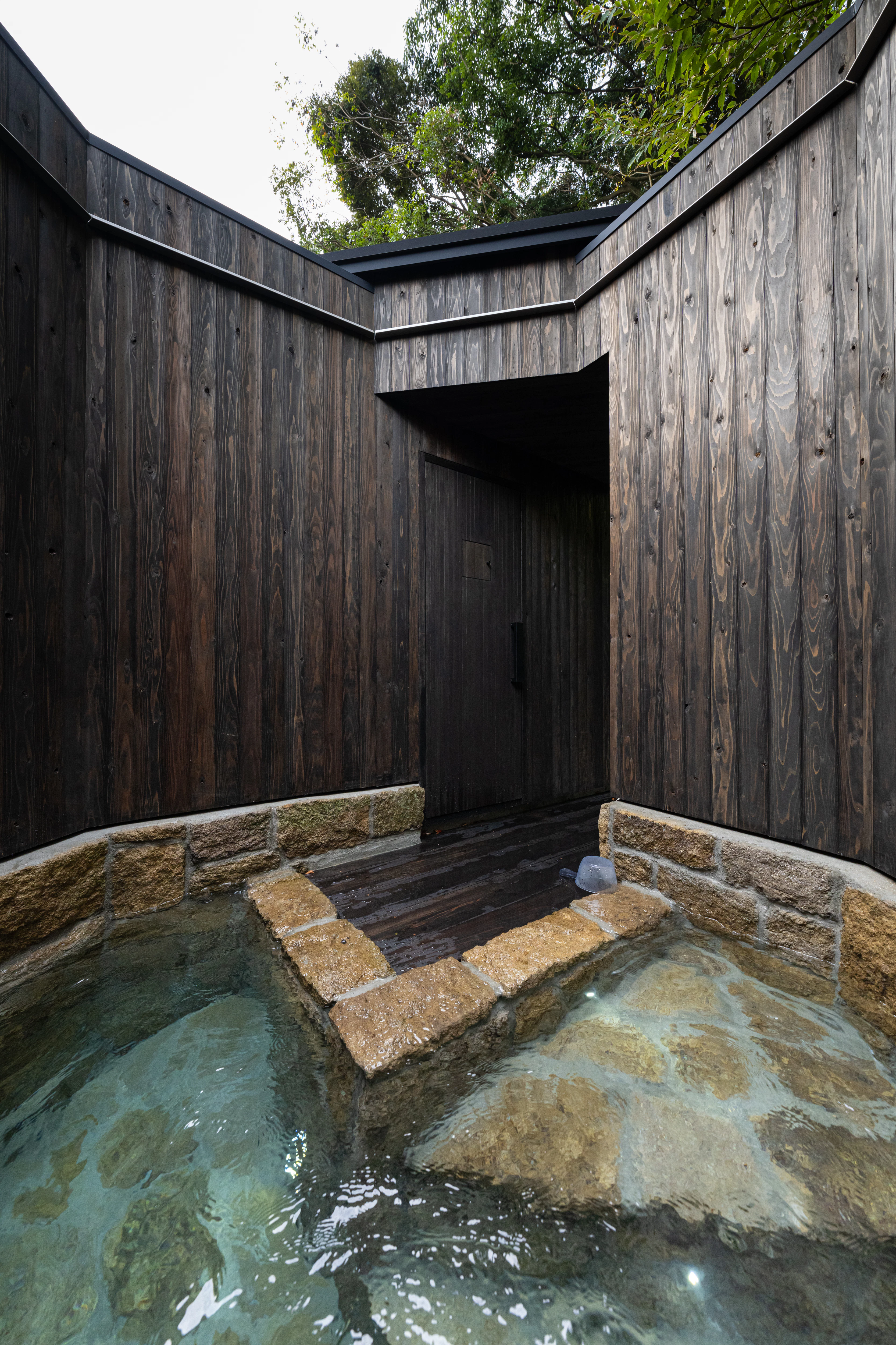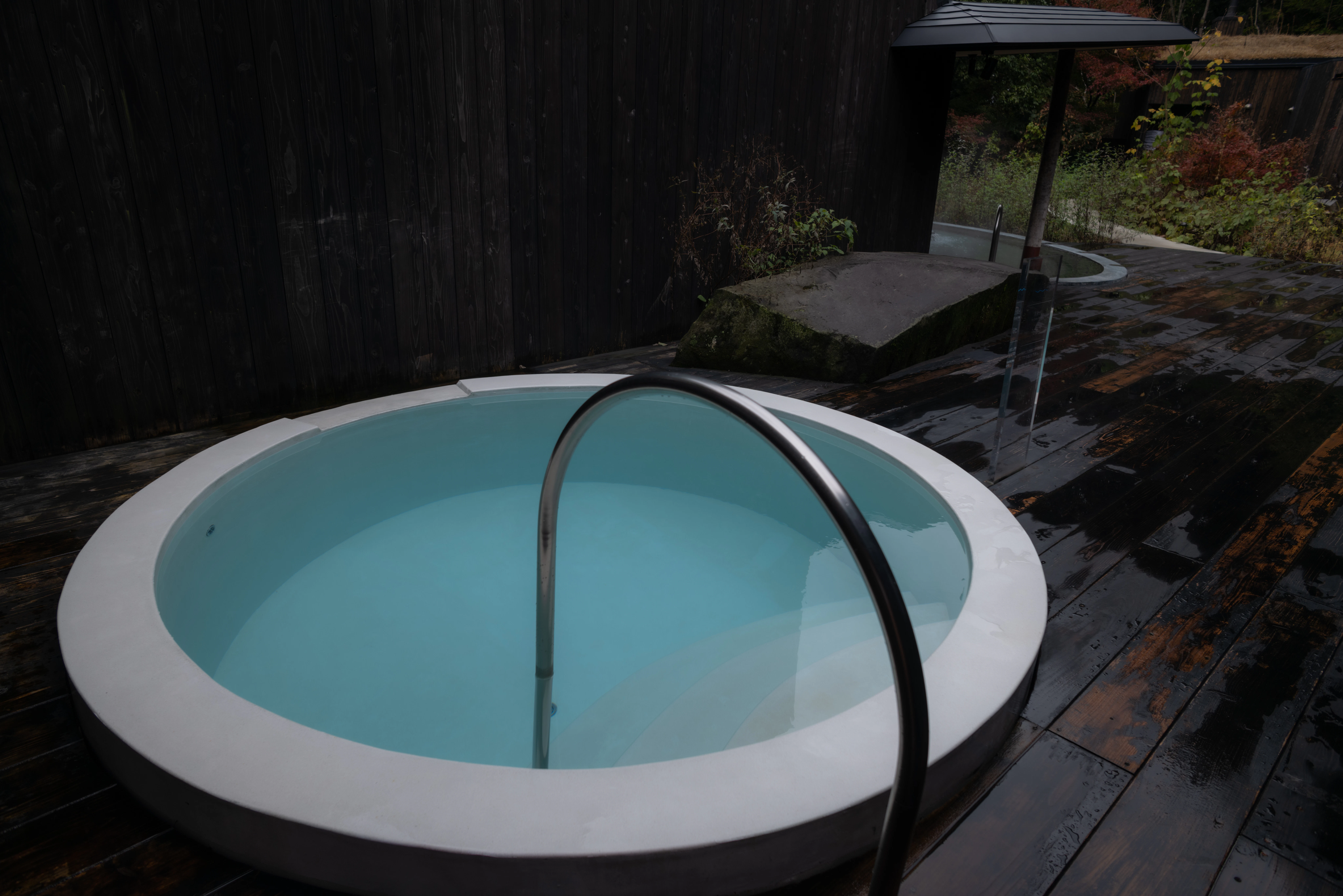 薪サウナ横の水風呂は深さ60cmの、御船山の天然水。ひんやりしつつもまろやかでした!すべてのサウナのすぐ近くに水風呂があり、理想の導線をよくわかっていらっしゃる!と頷いてしまいました。