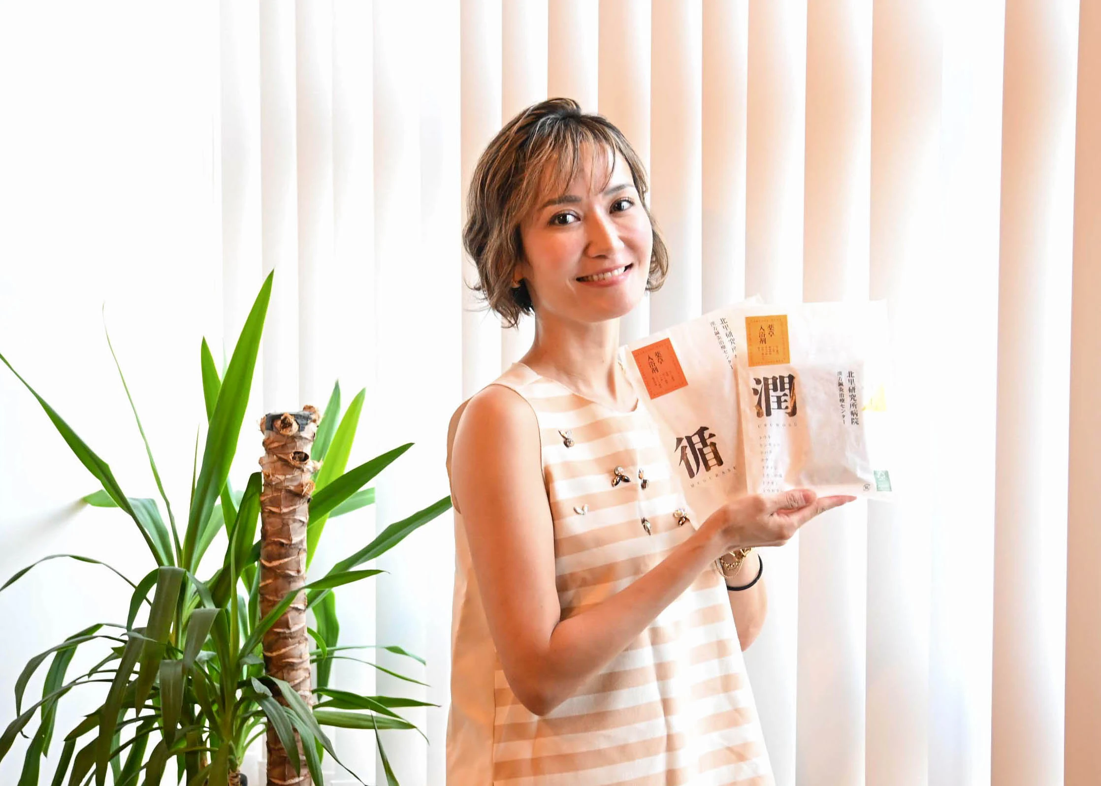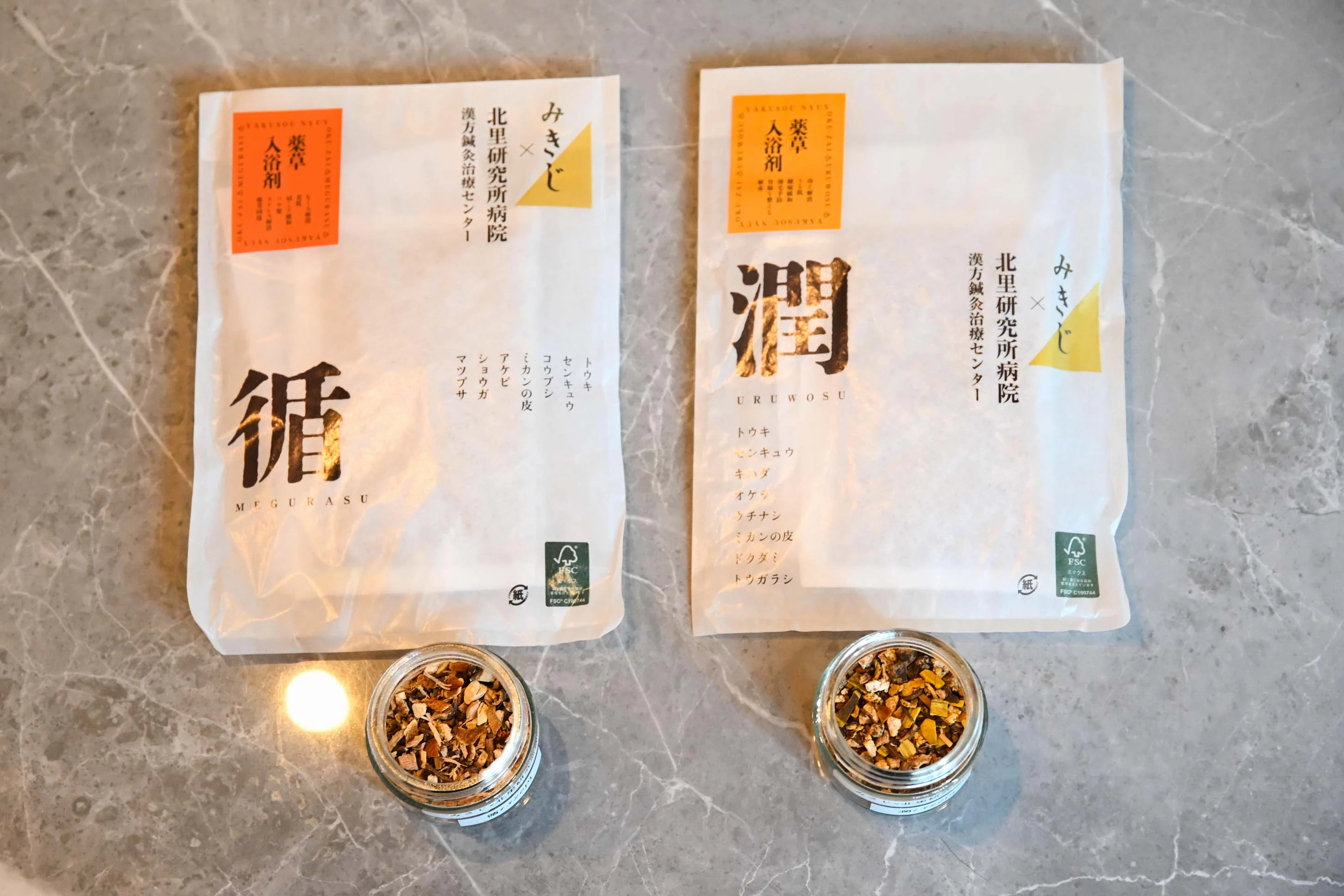使用しているのは、血の巡りを良くしてくれる薬草をブレンドした「循(MEGURASU)」と、肌の潤いを保つ薬草がブレンドした「潤(URUWOSU)」の2種類です。