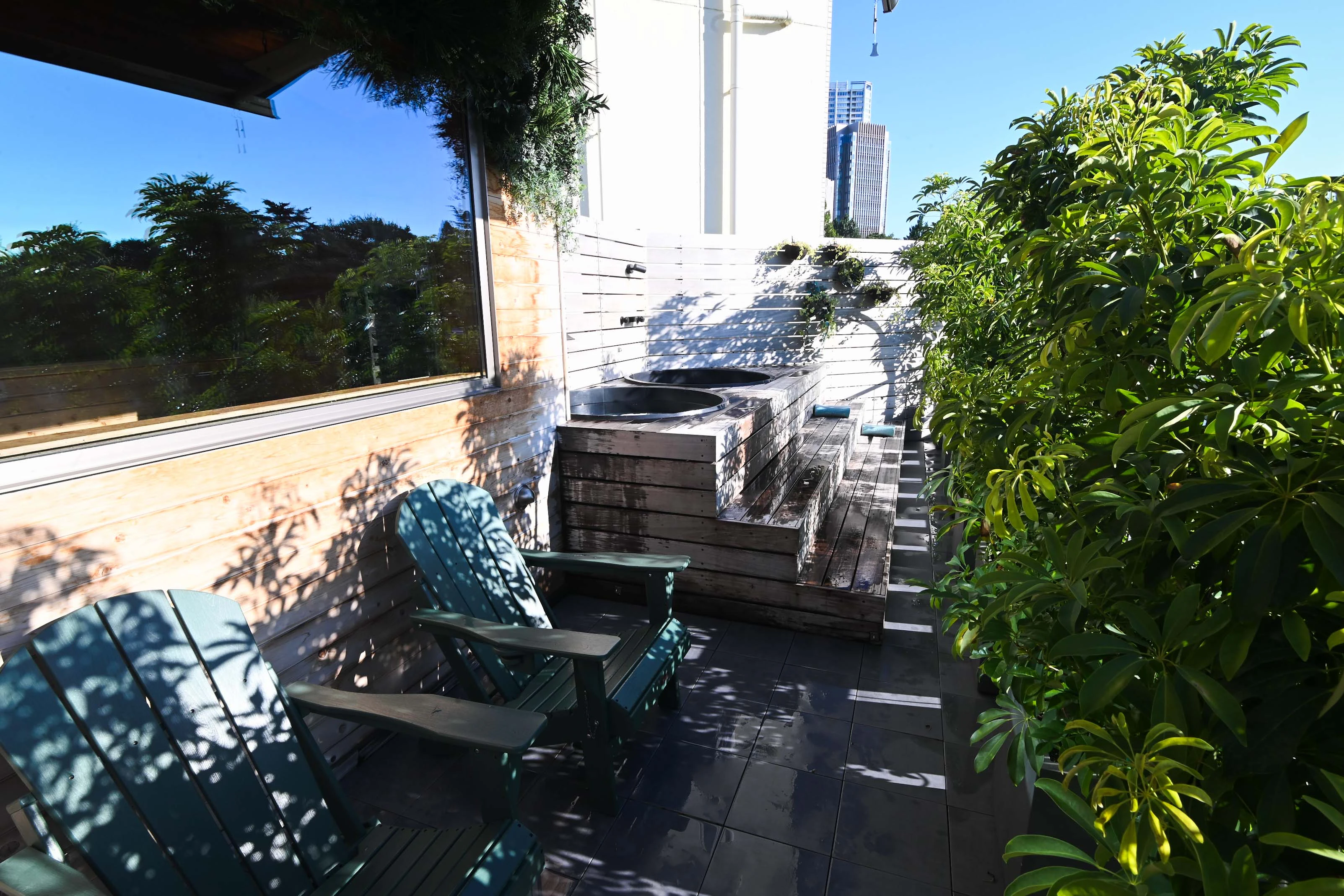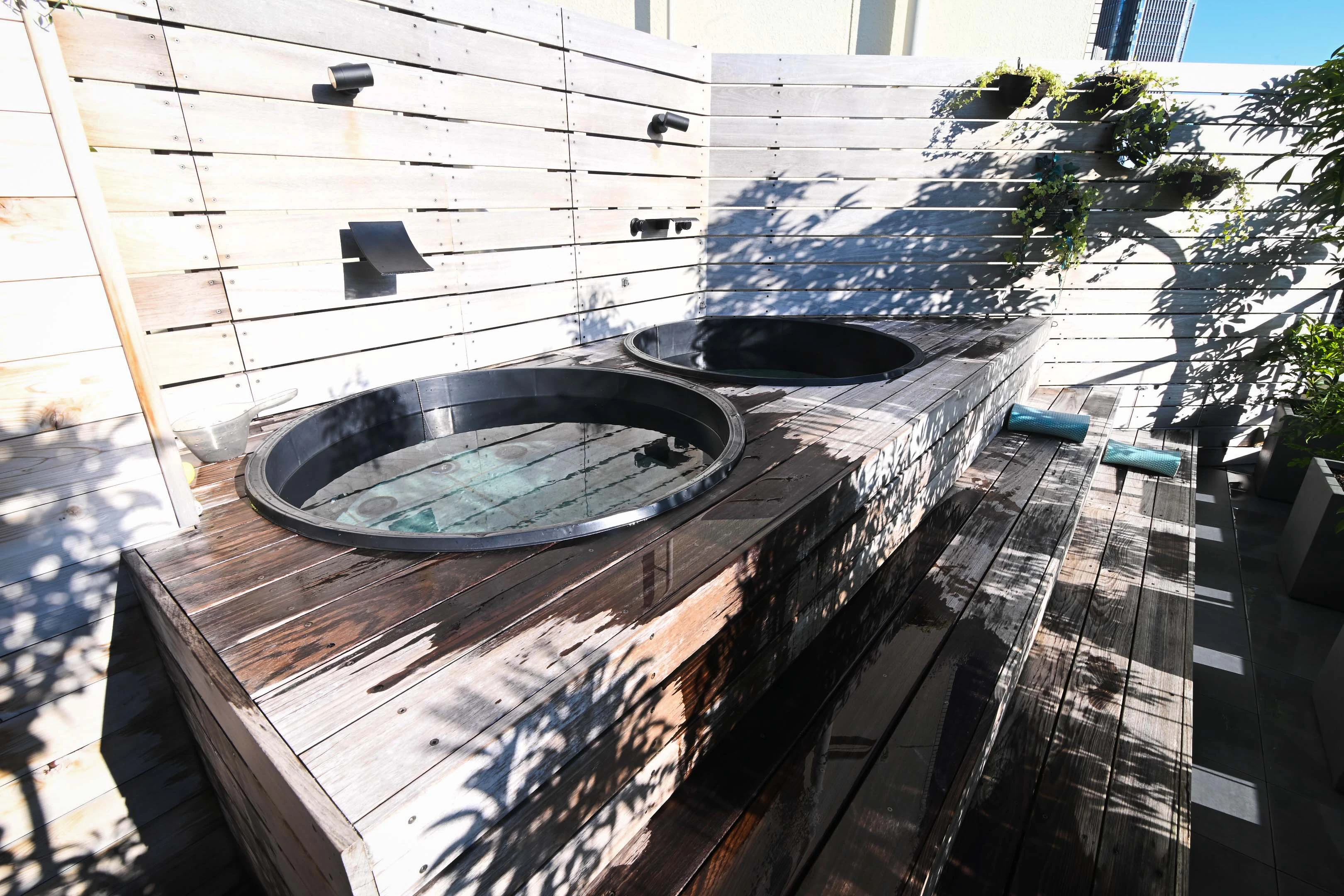 薬草サウナから出た後は、水風呂→そして外気浴へ。目の前に広がる景色、都内とは思えない開放感!空を想像以上に広く感じられて、ずっと座っていたくなります。