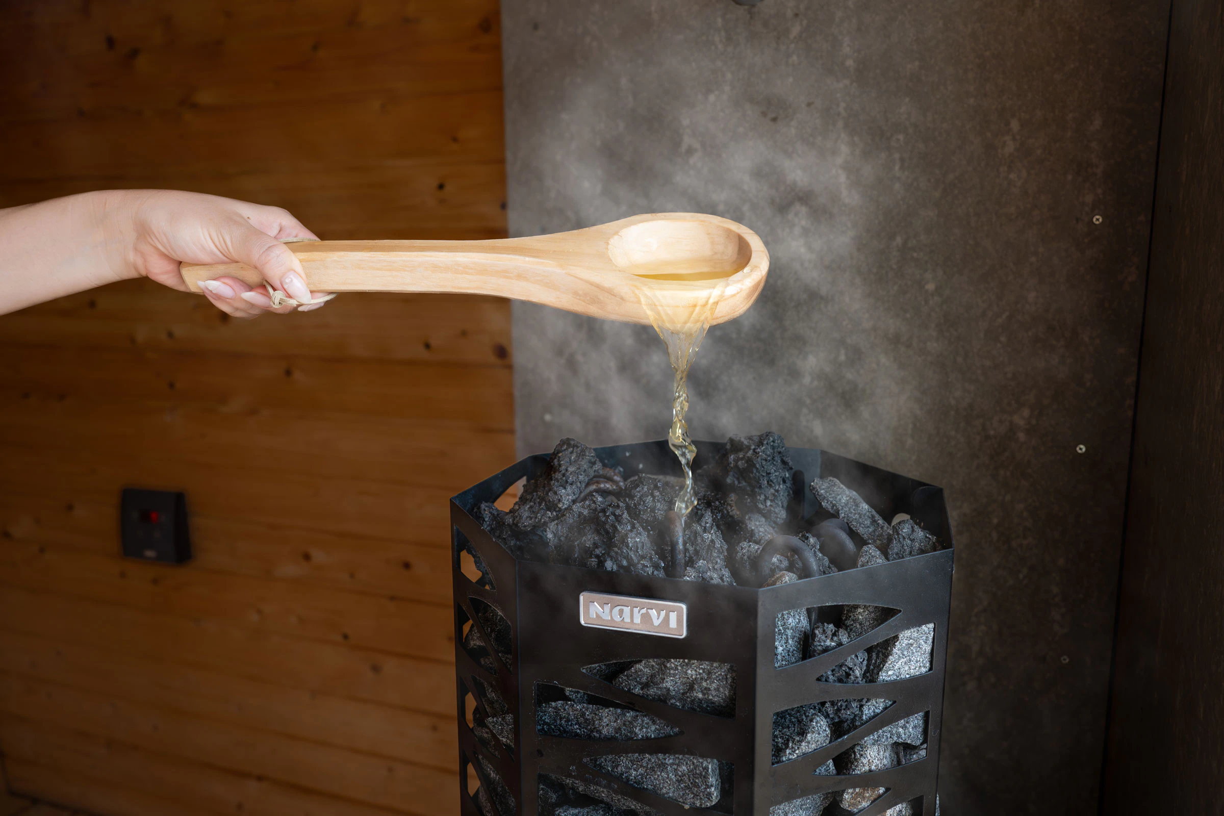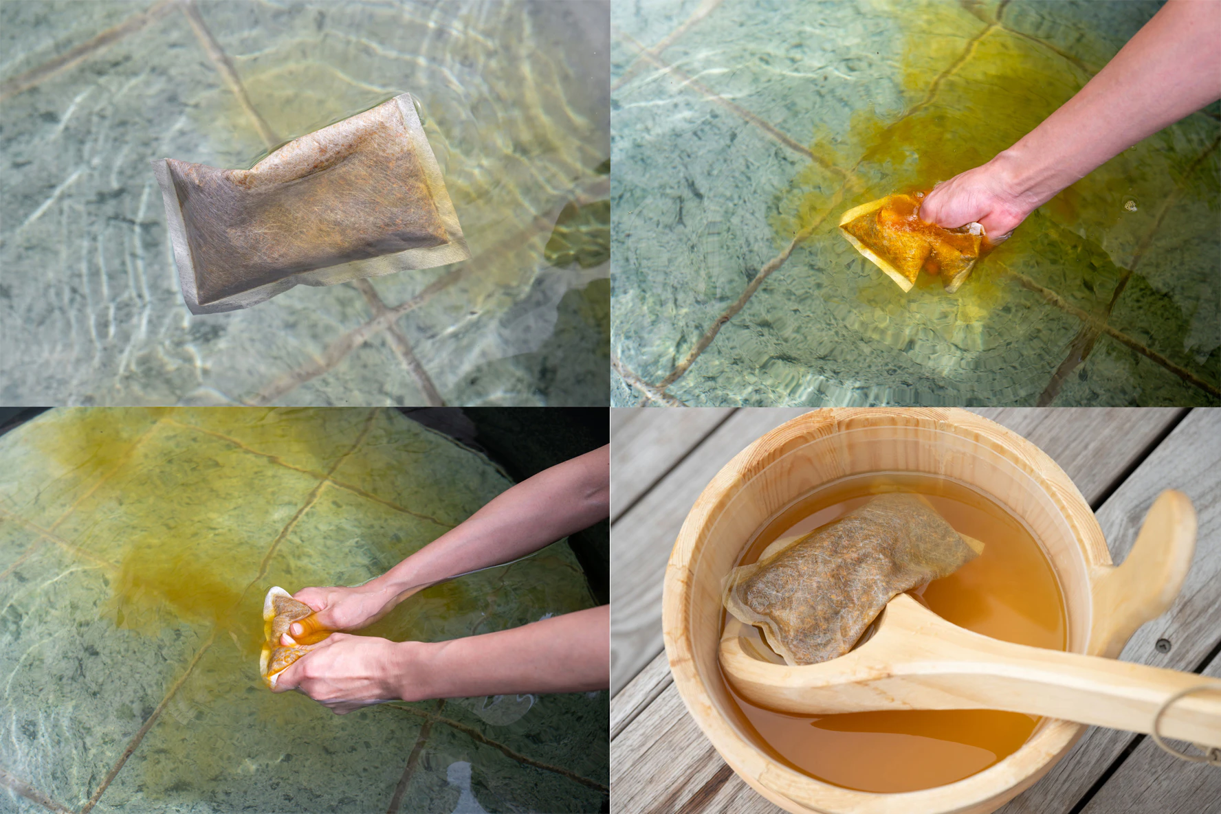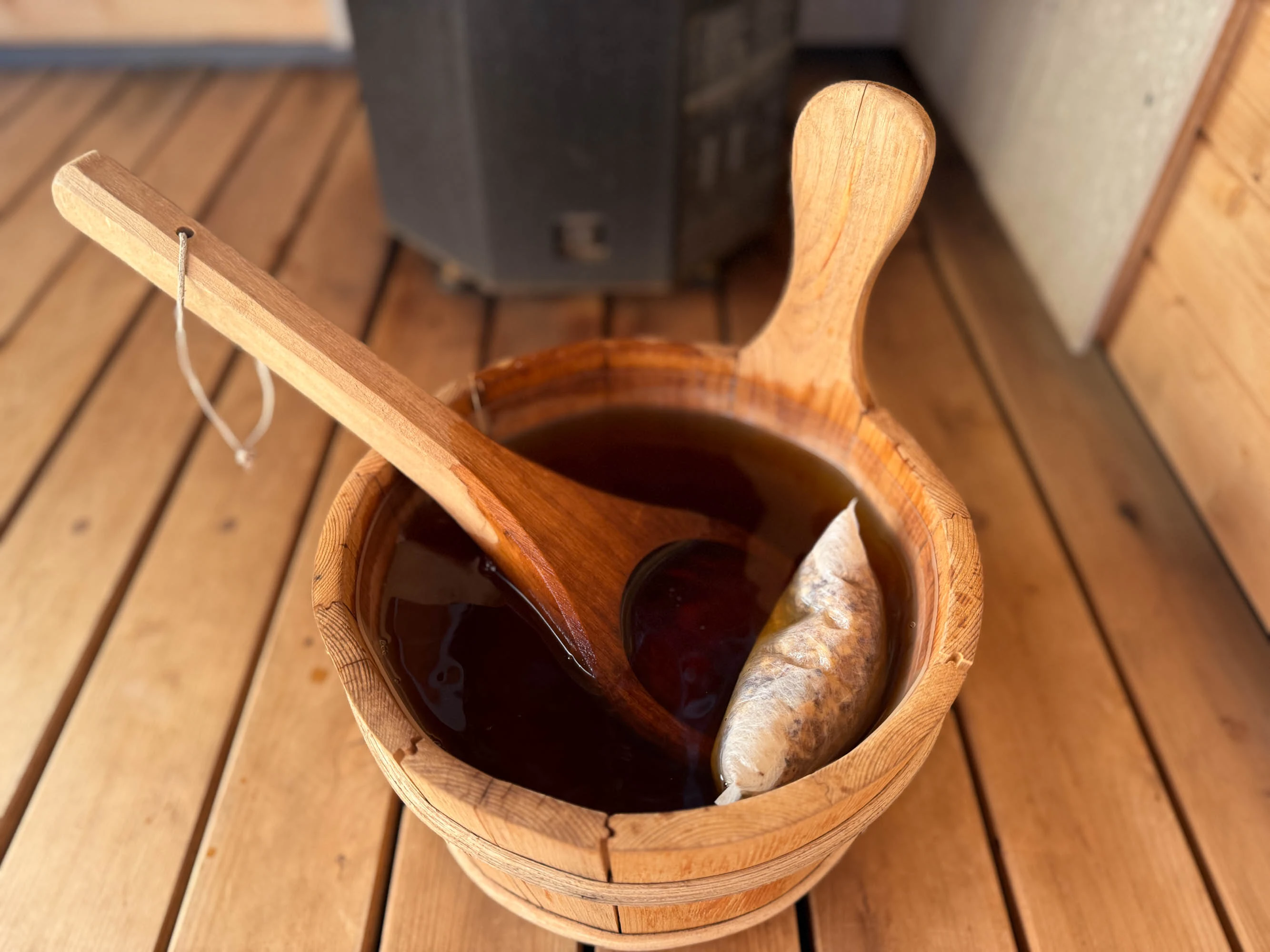 ロウリュ用の桶にも惜しみなく薬草をイン。ロウリュによる上からの蒸気、蒸し器による下からの蒸気に挟まれれば、完全に「全身を薬草で蒸されている」状態へ!