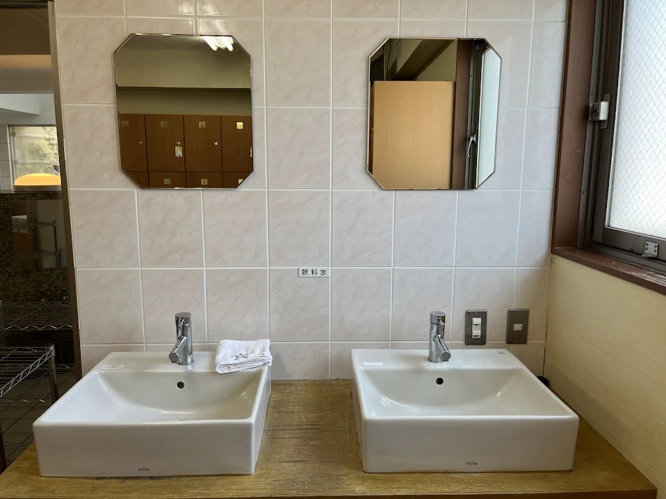 飲料水のラベルつきカランがあるのも嬉しいところ。お風呂でたくさん汗をかいたあとは、しっかり水分補給しましょう。
