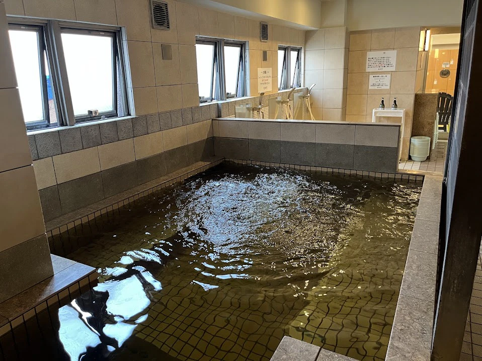 お湯は黒湯のような薄い茶褐色。メタケイ酸が豊富に入っている弱アルカリ性の天然温泉です。