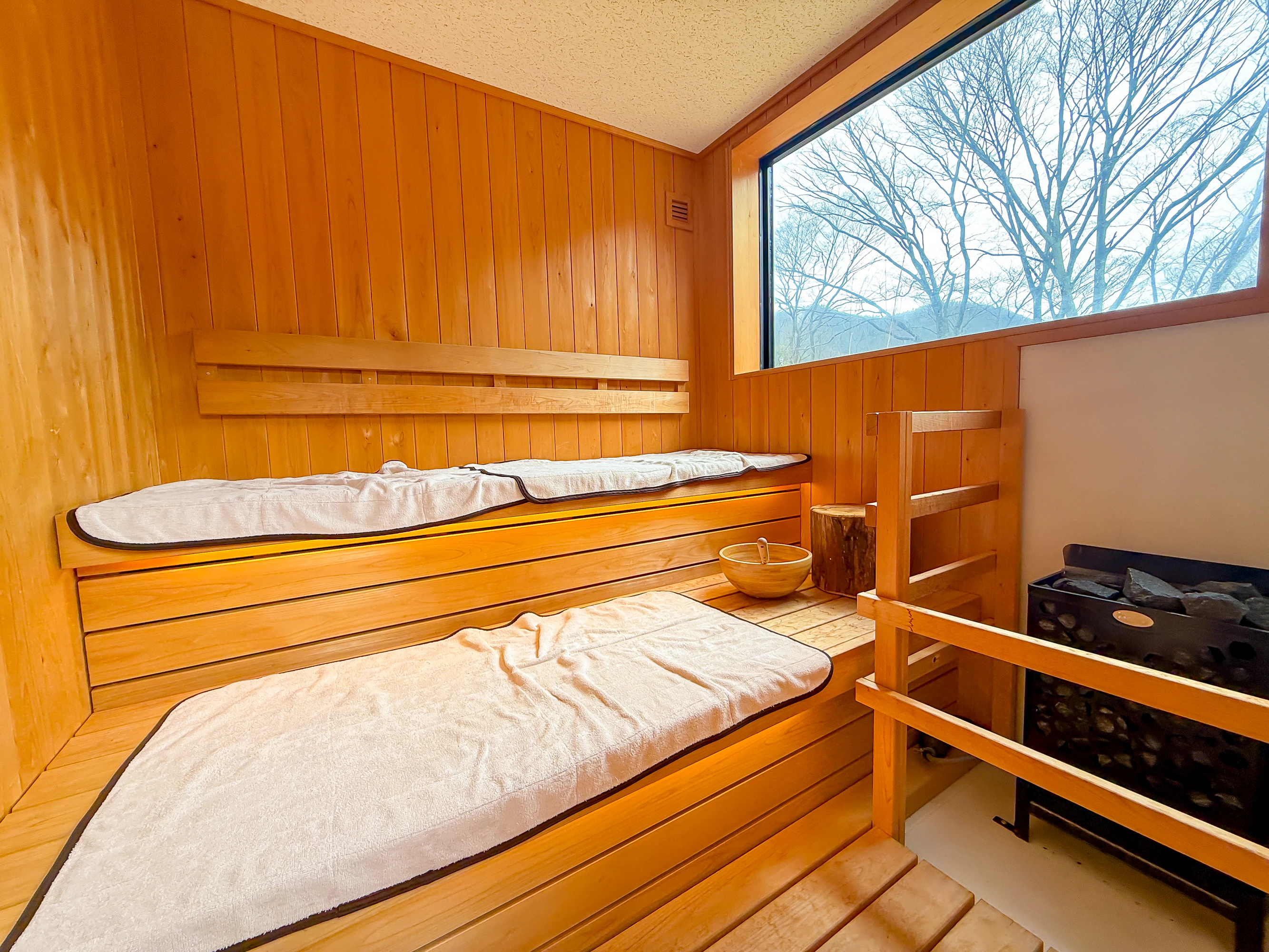 サウナ室は、男女ともに本格的なフィンランド式。