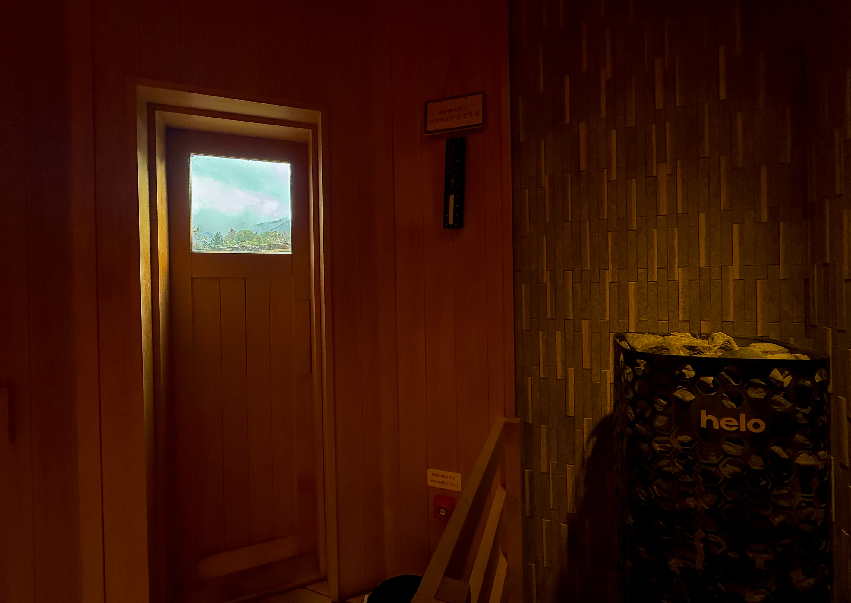 サウナ室(女湯)の下段に座ると、小窓からちょうど山の景色が…。サウナに入りながら自然を感じられるのもチルポイントです。