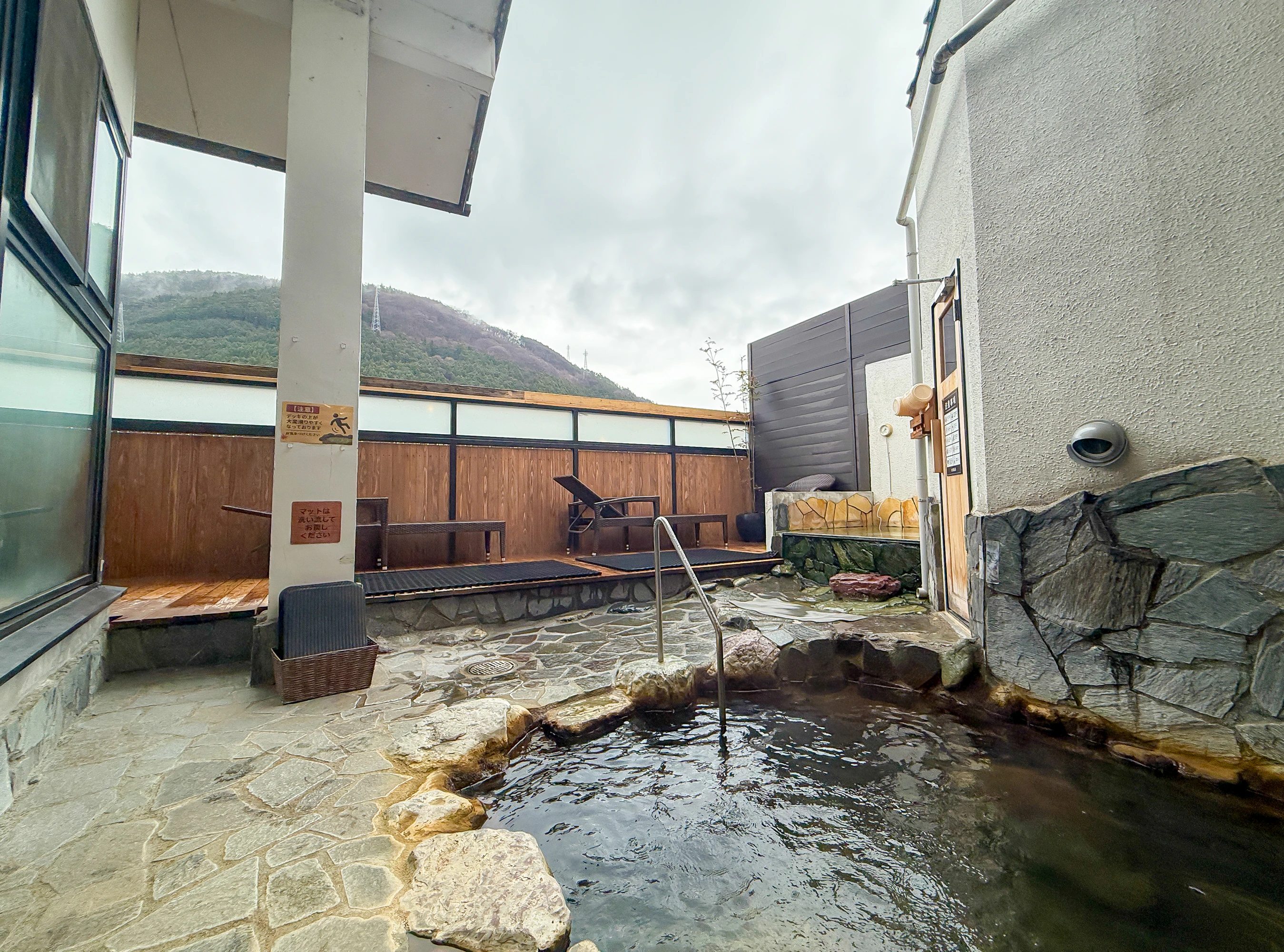 露天風呂からは凛と佇む山「荒神山」を拝むことができ、コンパクトな空間ながら自然に囲まれた開放感を味わえます。すぐそばを流れる川のせせらぎを感じるのも乙なひとときです。