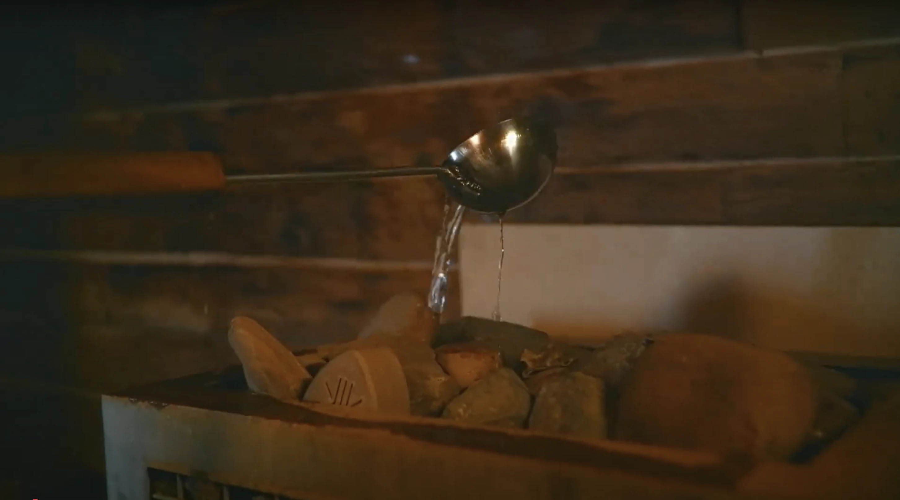 まずは座面に仰向けに。ゆっくりとロウリュが開始され、蒸気で身体を温めます。