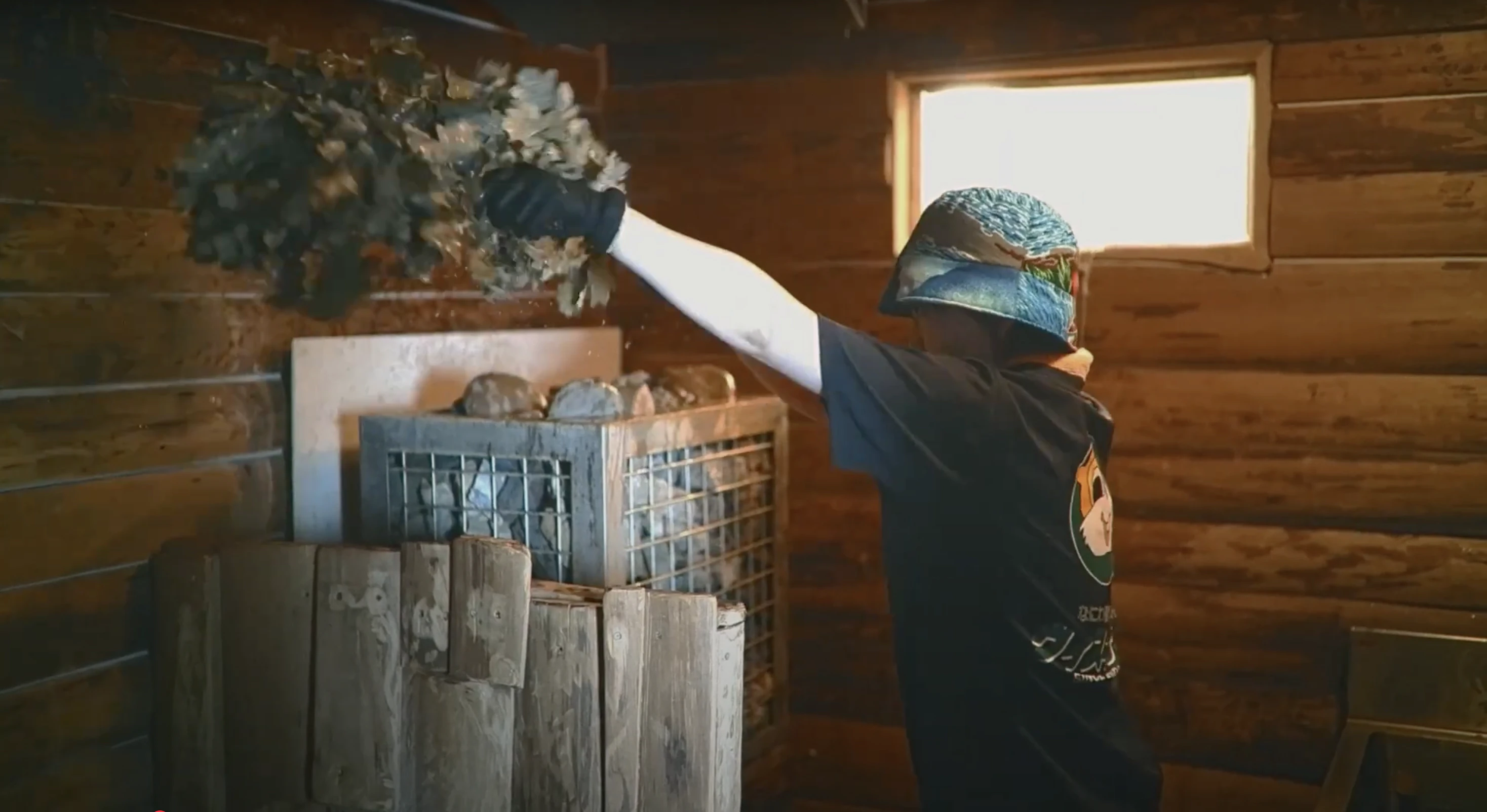 ウィスク(=白樺などの植物の枝葉を束ねたもの)を用いて、蒸気を拡散。