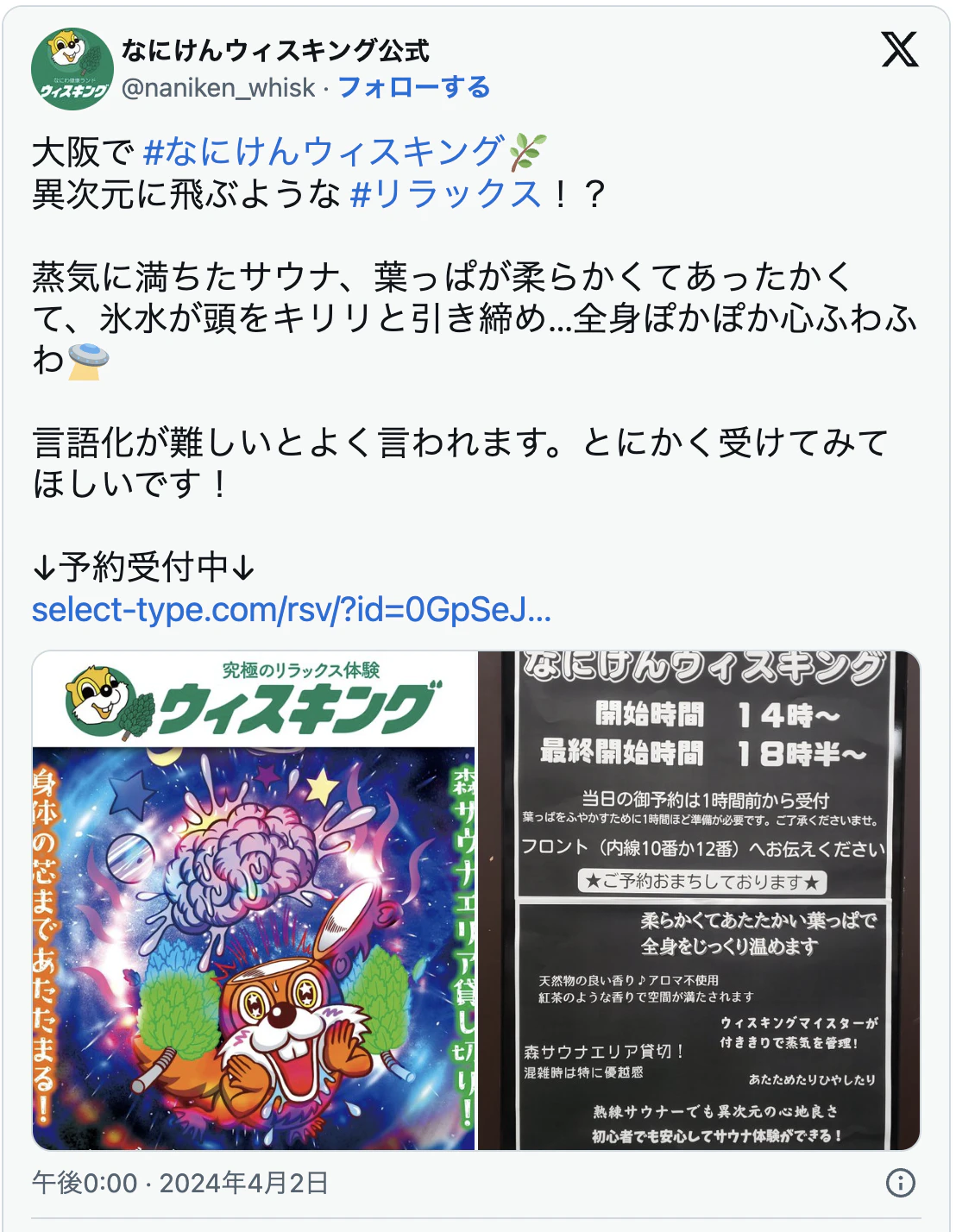 なにわ健康ランド 湯〜トピアのウィスキング。新たなサウナの扉が開かれる、そんな新体験となりました。