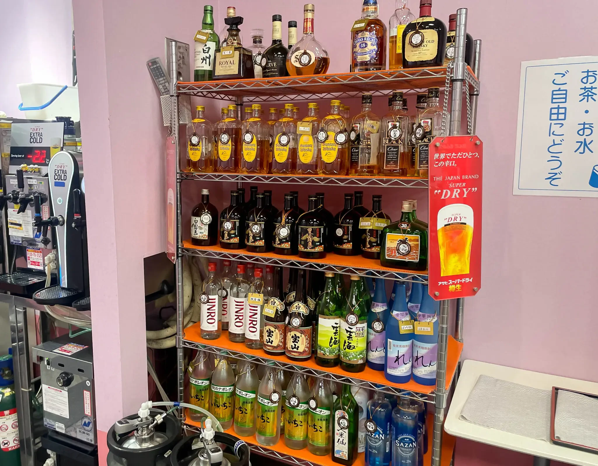 棚にはボトルキープの数々を発見。サウナブームが起こるずっと前から、男性諸君を癒し続けてきたオアシス・ニューウィングのあり方を感じさせられます。