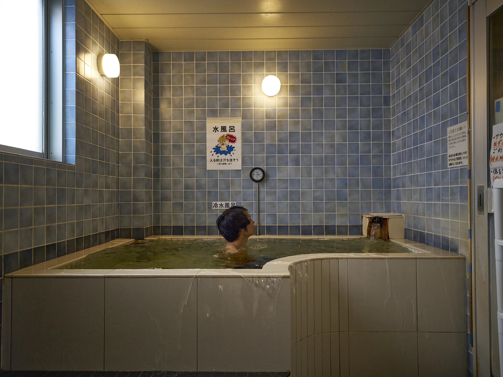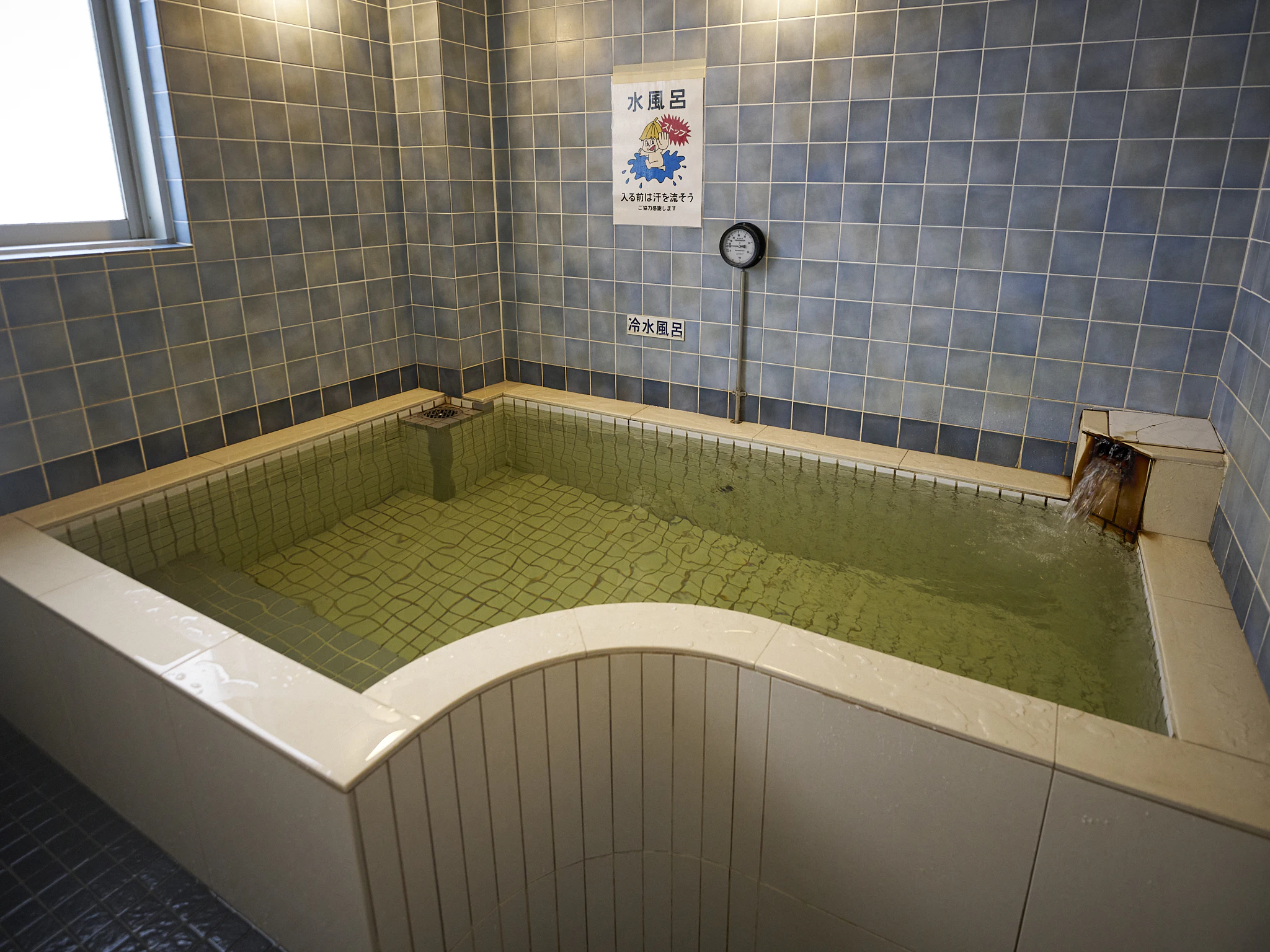水風呂は、2階の壁いっぱいに浴槽が広がりスペースは十分。少し黄みがかっているのは、井戸水を掛け流しにしているからだそうです。温度は22℃ほどで、ゆっくりとクールダウンするのにぴったりでした。