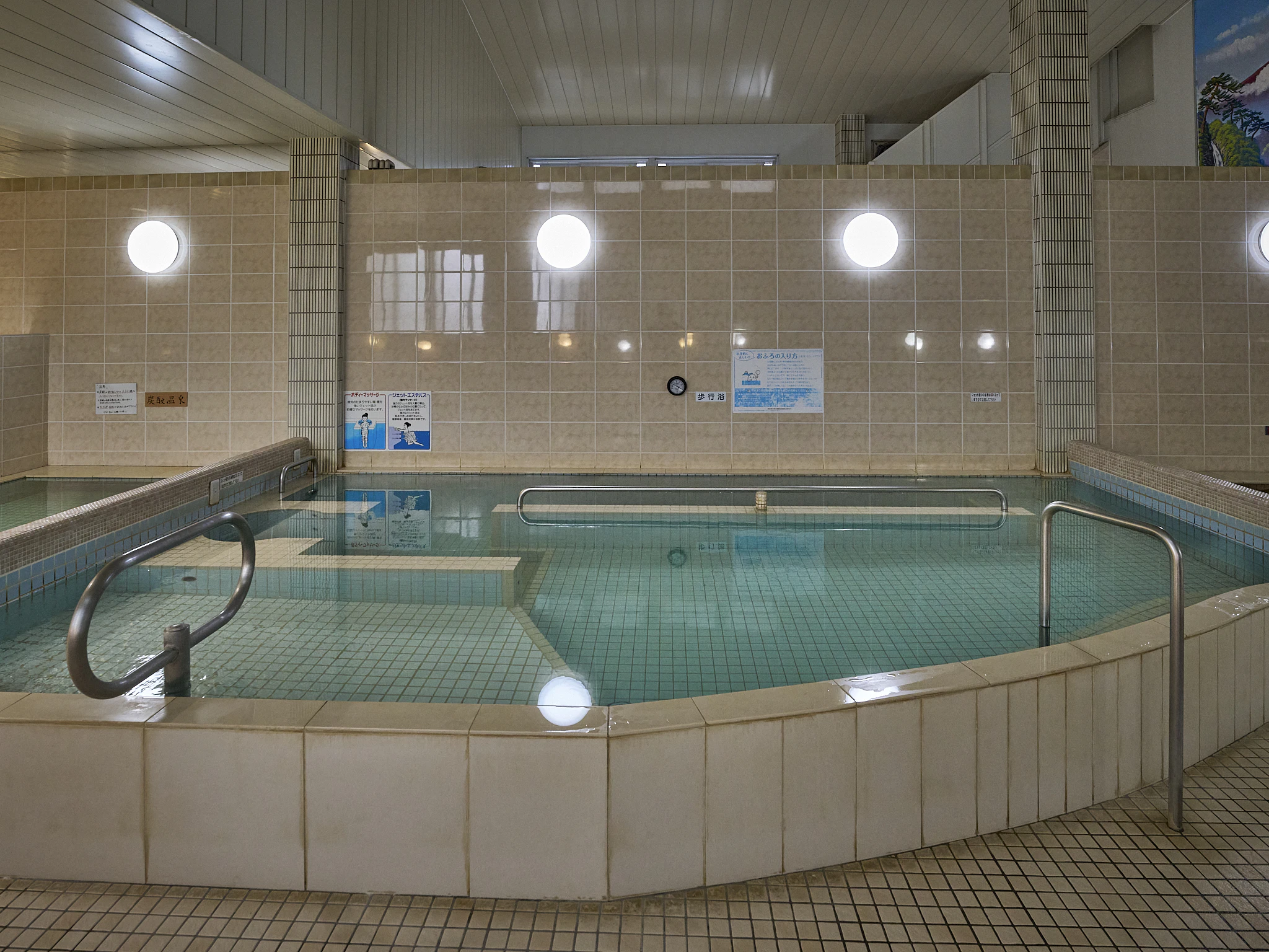中央にはジェット風呂と歩行浴。歩行浴は、床に足ツボを刺激する小石が埋め込まれており、ゴロゴロとした感触が楽しめます。お風呂のタイプがそれぞれ違うので、時間をもてあまさずにたっぷりチルできました。