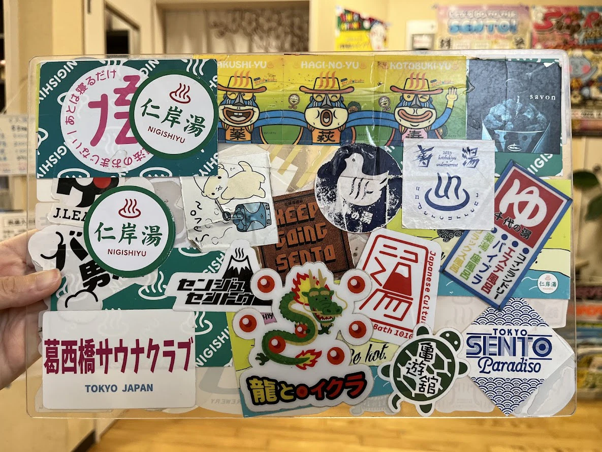 ロビーにはステッカーボードを置き、仁岸湯だけでなく他の銭湯を知ってもらういい場にもなっています。こうした工夫が、ロビーにいる時間を一層ワクワクさせてくれそうです。
