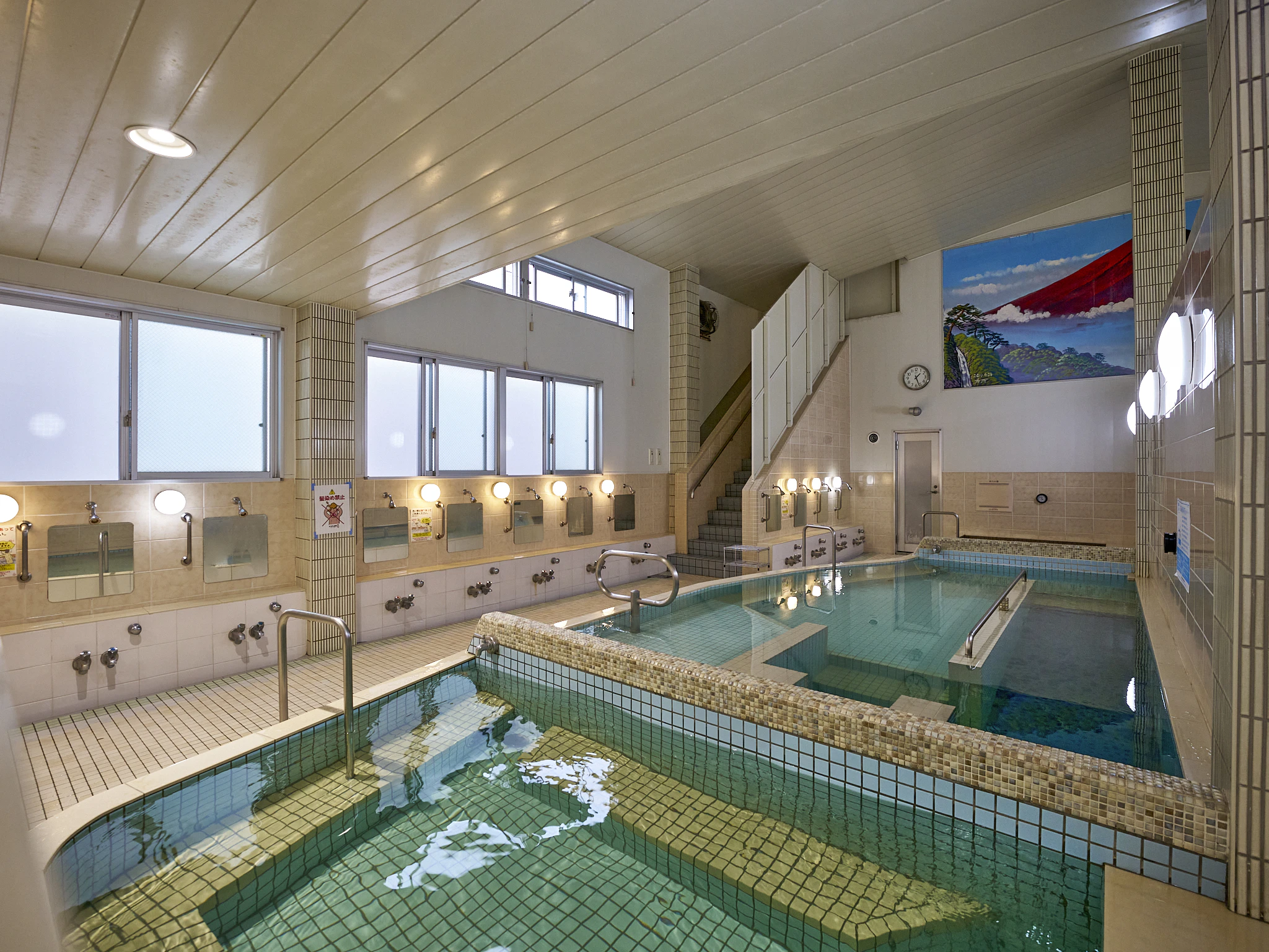 浴室はピカピカ!奥のタイル絵には赤富士が見え、落ち着いた雰囲気をかもし出しています。洗い場と浴槽の間のスペースが広いのもうれしい点です。