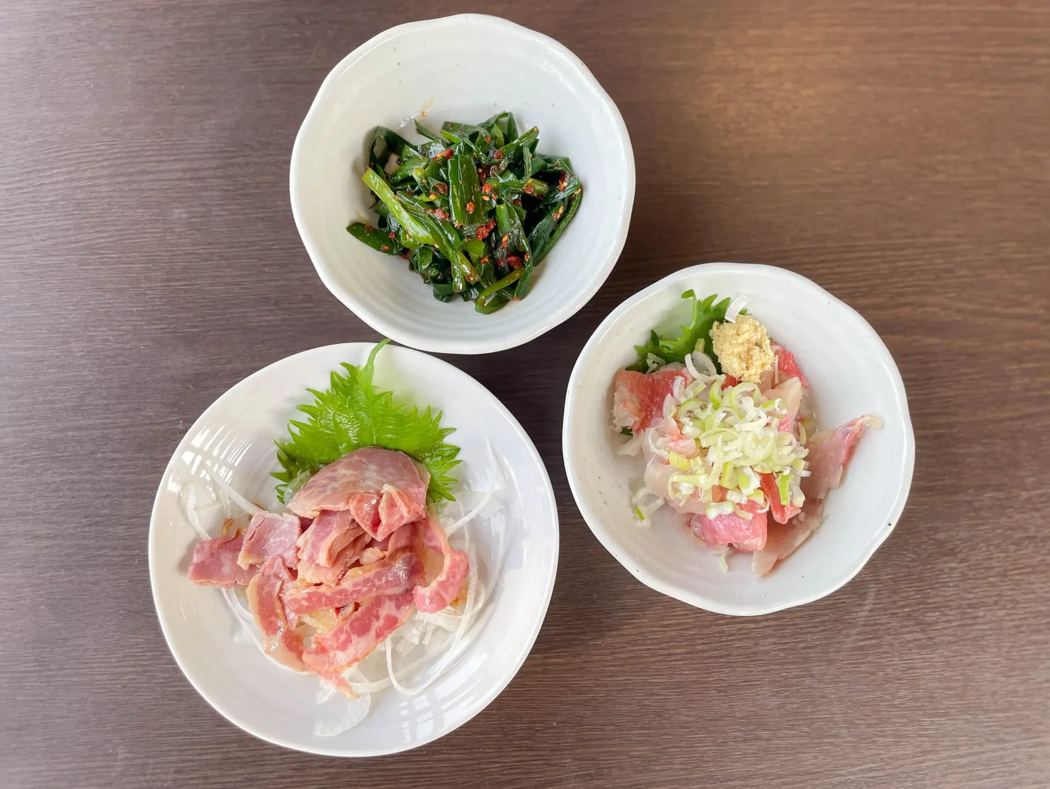 ここおふろ国は、「金目鯛」と「ニラ」がイチオシメニュー!ということで、「キンメダイの湯引き」「にらファンタジー」、そして濡れ頭巾ちゃんが「温浴施設で食べれるはめずらしい」と即決した、牛肉の燻製にお好みでポン酢をかけて食べる「牛のさいぼしポン酢」の3種類を注文。
