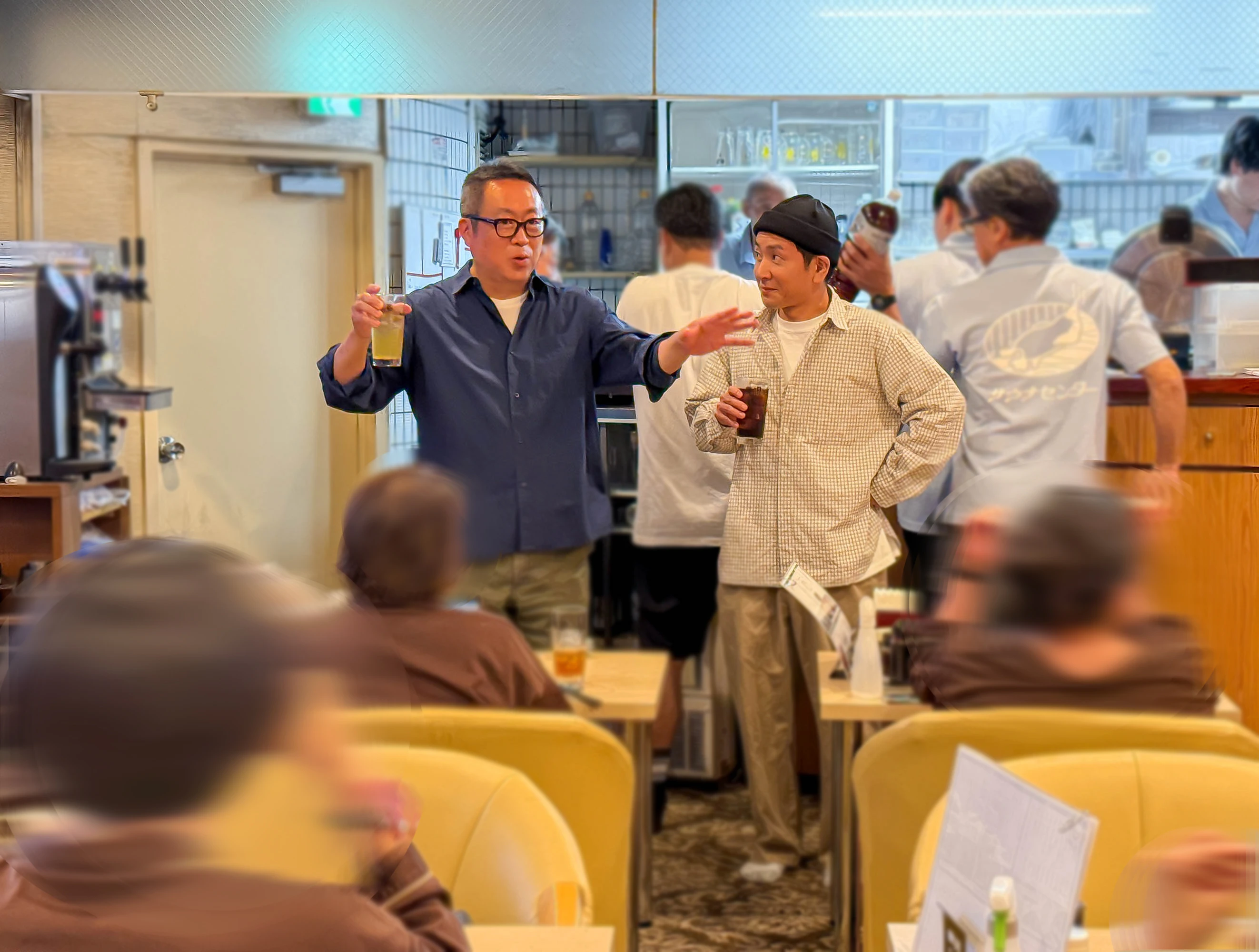 18時30分からは、5階の食堂で『スナックぬれずきん』がスタート。スナックのママとしてレジェンドサウナーの濡れ頭巾ちゃん、チーママとしてスペシャルゲスト・サウナ大好き芸人のマグ万平さんが登場しました。二人そろっての登場に拍手喝采!