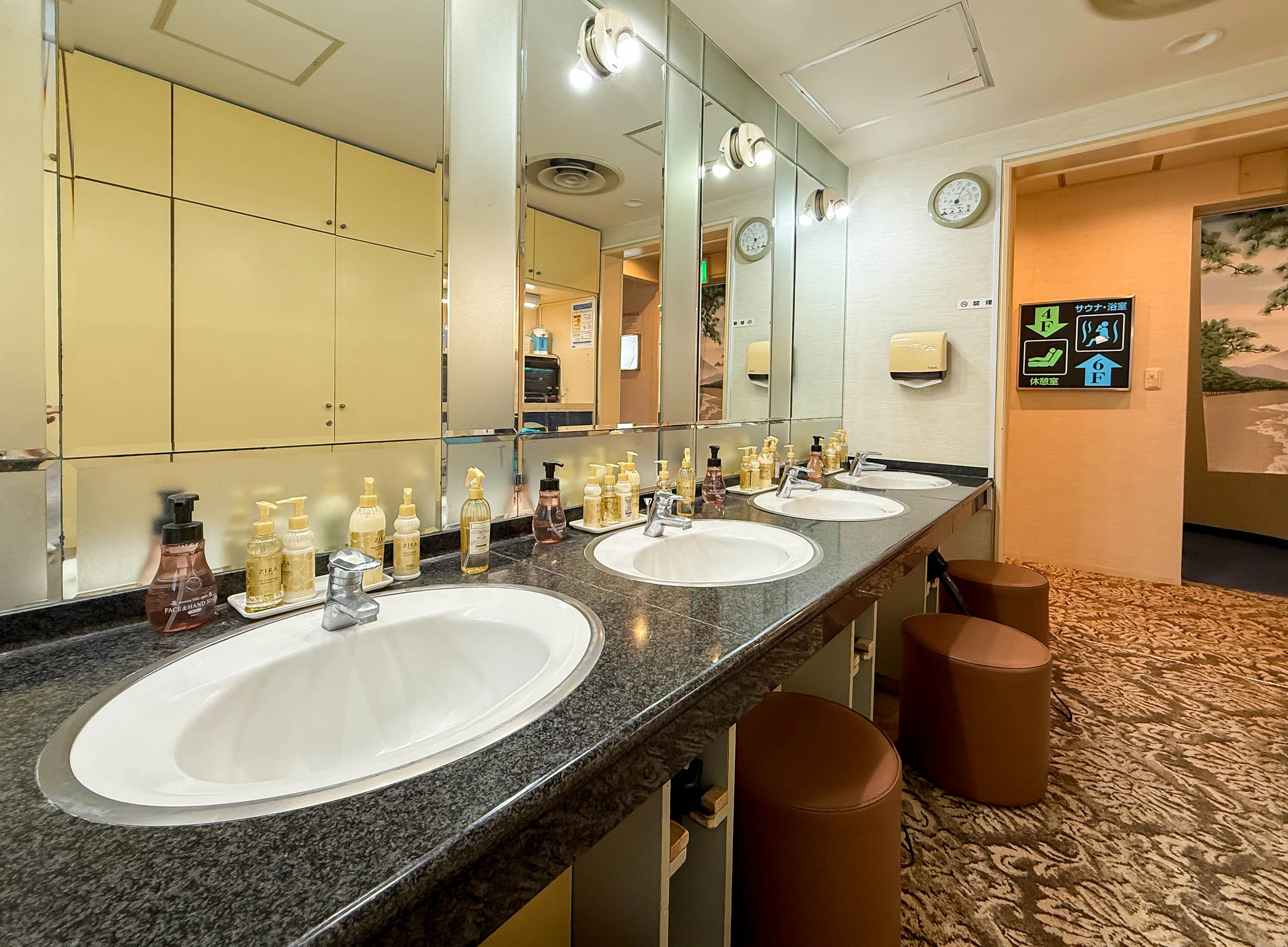 パウダースペースは、5階フロアに。化粧水だけでなく、ボディクリームやヘアウォーターの用意もあって驚きました!人の行き来がある環境ではあるので、オープンすぎる環境が気になる方は、脱衣所内のミニパウダースペースの利用がおすすめです。(アメニティの設置は5階のみ)