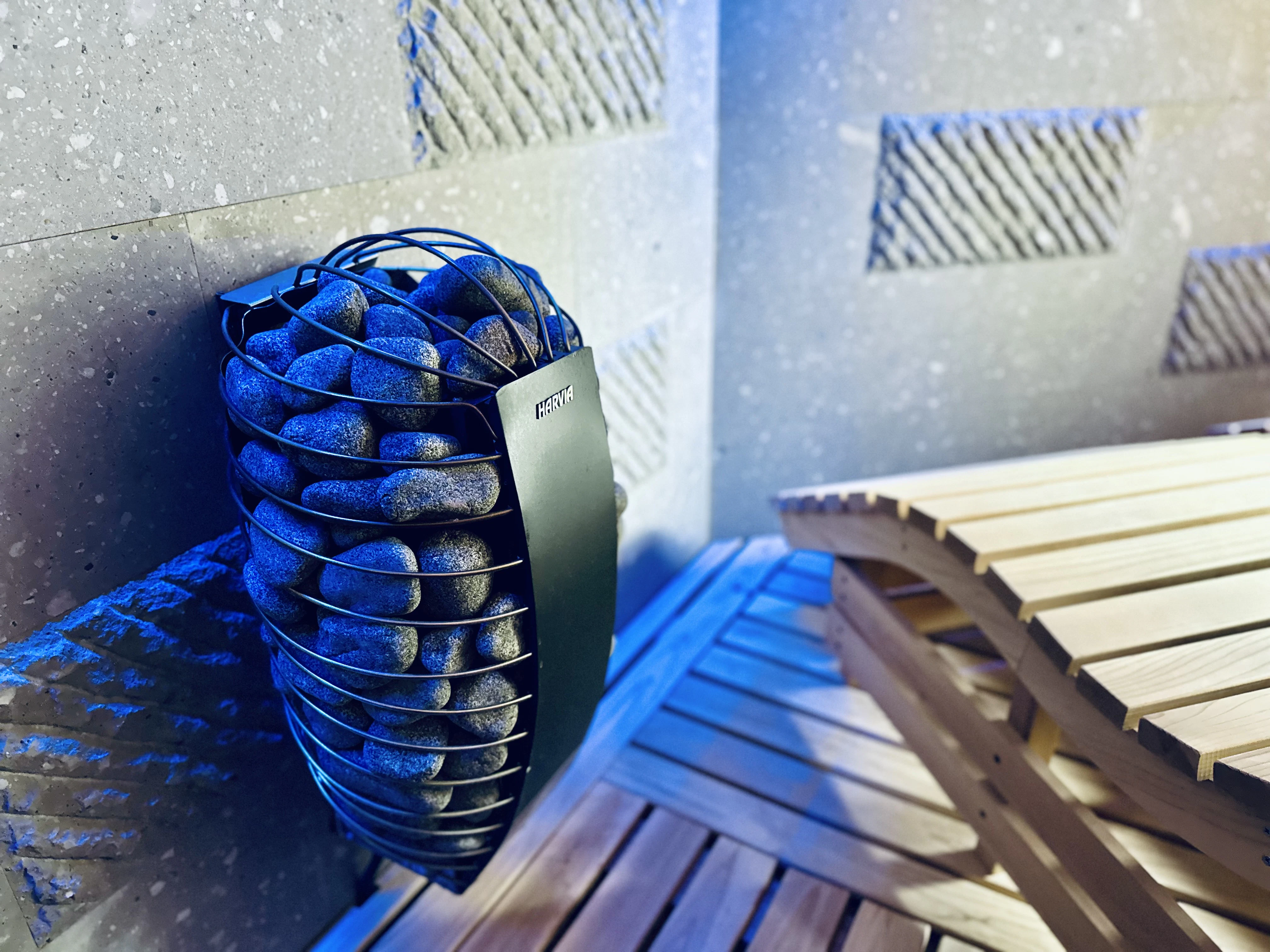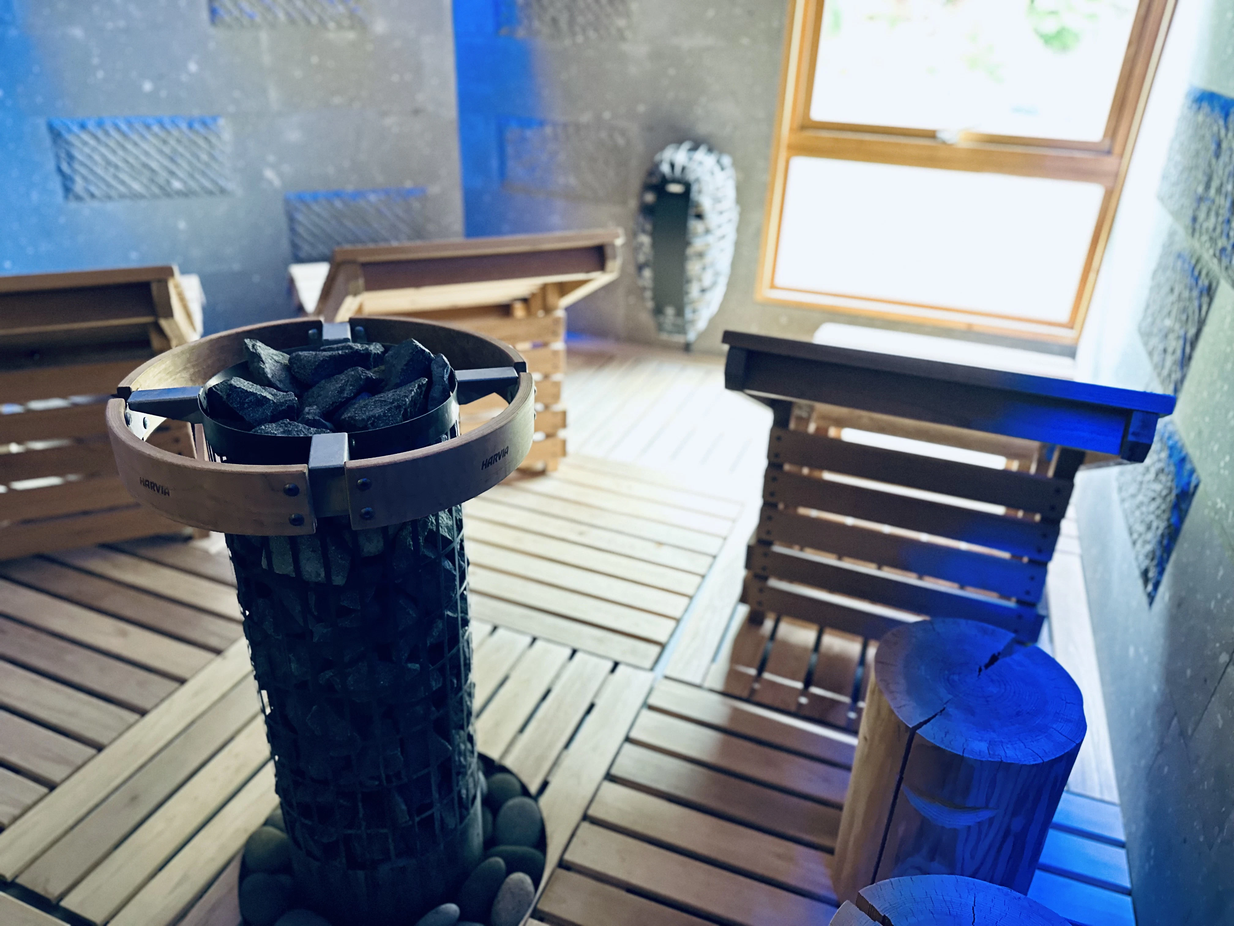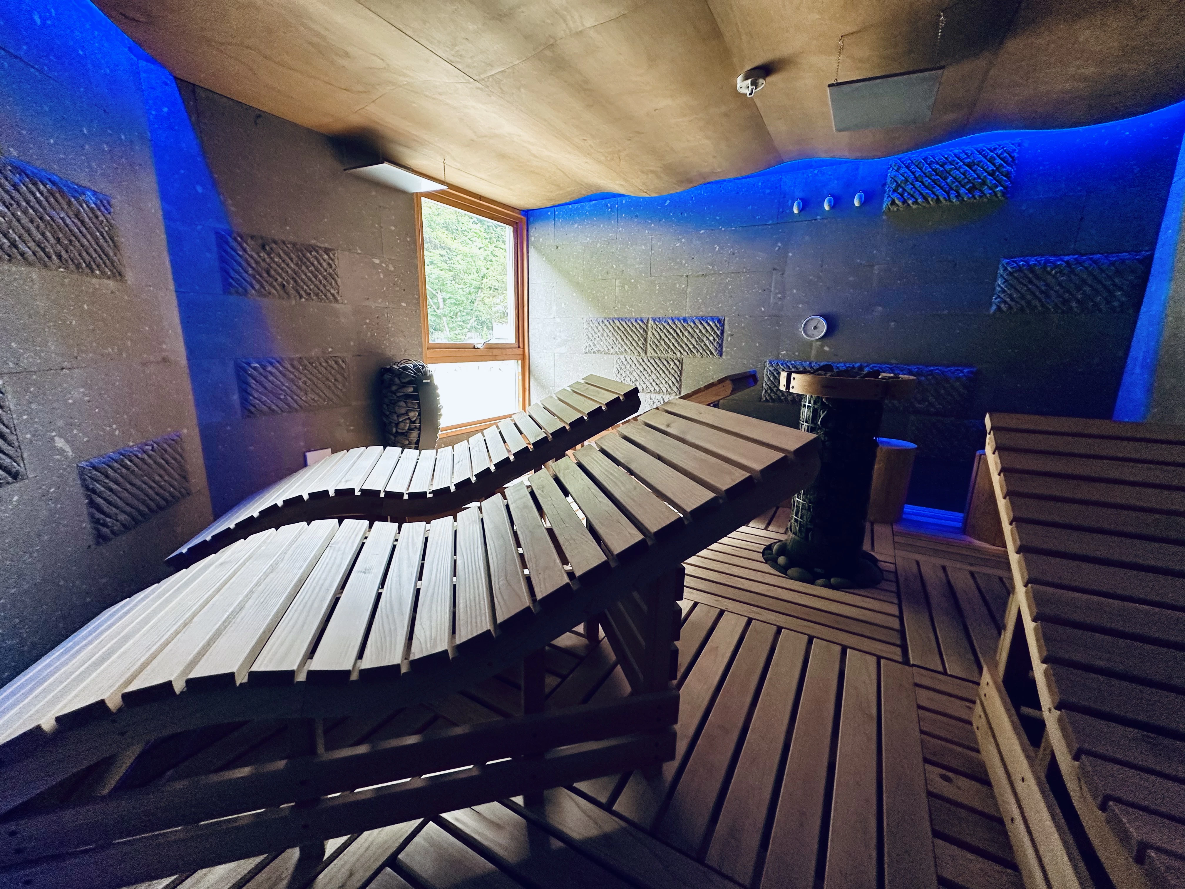 続いてやってきたのは、小樽にある洞窟をイメージしたというサ室です。照明が青くて、気持ちがやすらぎます。