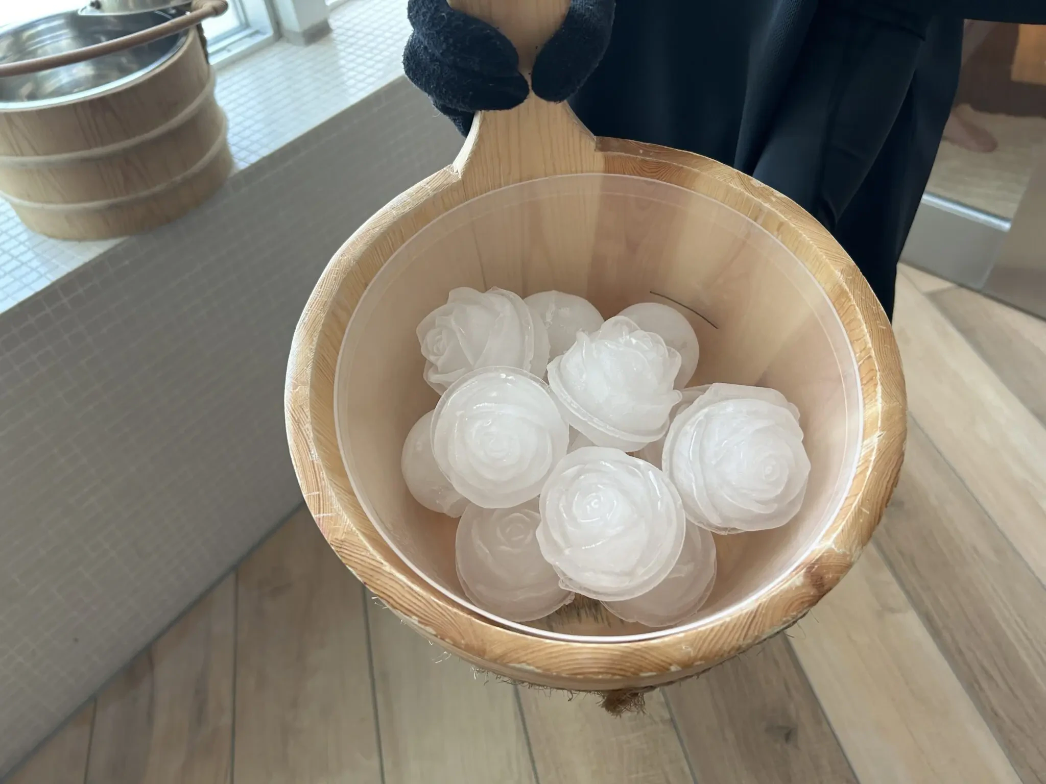アロマ水を凍らせたキューゲルを使ってロウリュを行います。バラの形をしていて可愛かったです!アロマの香りは韓国フェアにちなんでよもぎを使用していました。