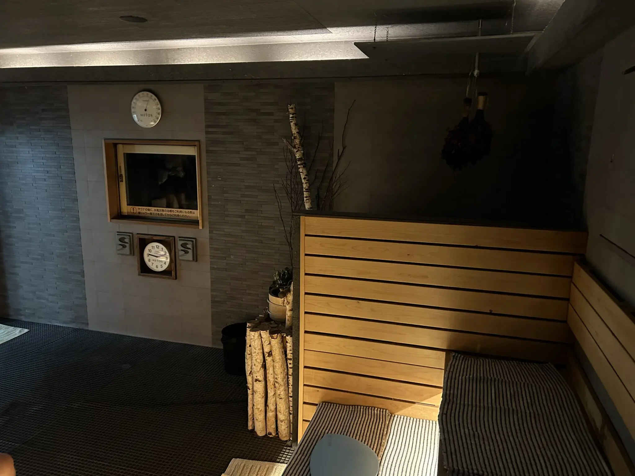 木の香り漂うフィンランドサウナ。定員は約30名でなかなかの広さ!落ち着きある照明がかなりチルいです。