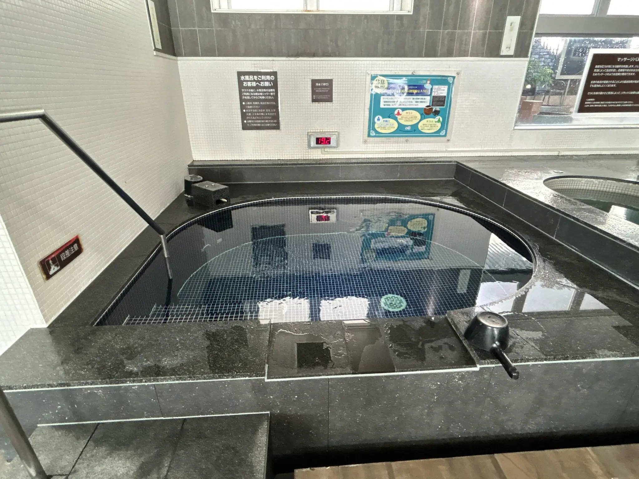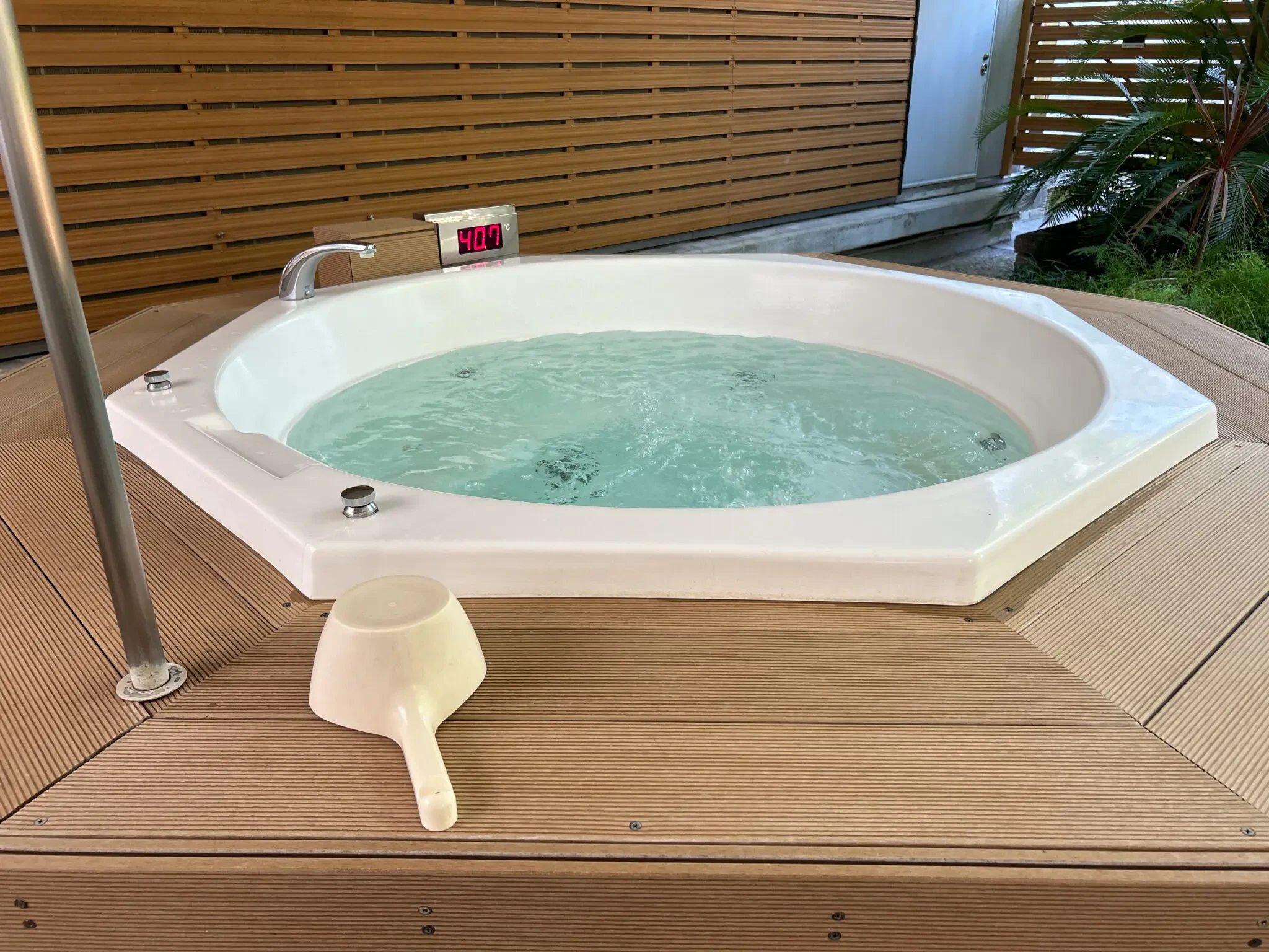庭園風景を楽しめる露天ジェットフォームバス。毎週金曜日にレディースデーを開催しており、バラ風呂が楽しめるのだそうです。
