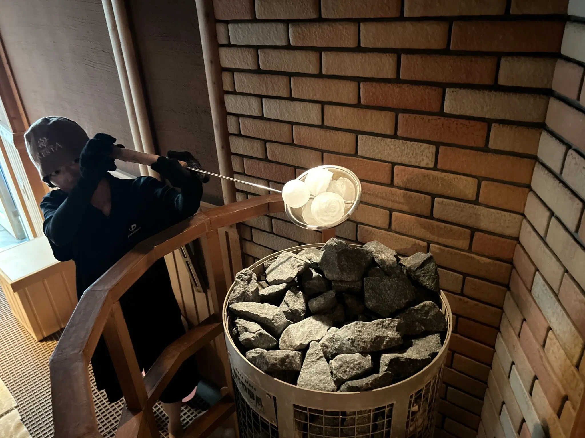 ロウリュで体を温めたあとにヴィヒタを氷のしずくに付けて頭から背中に降り注ぎます。サウナなのに冷たいという他では体験できない不思議な感覚が楽しめました。