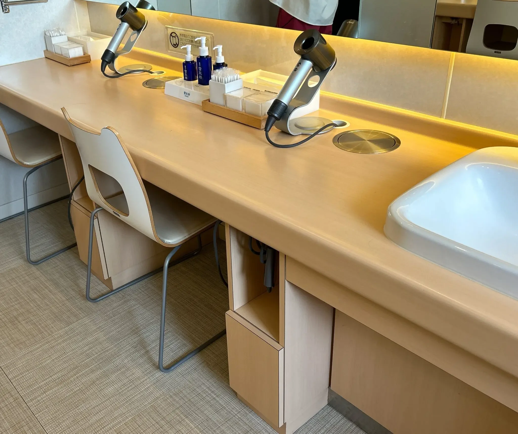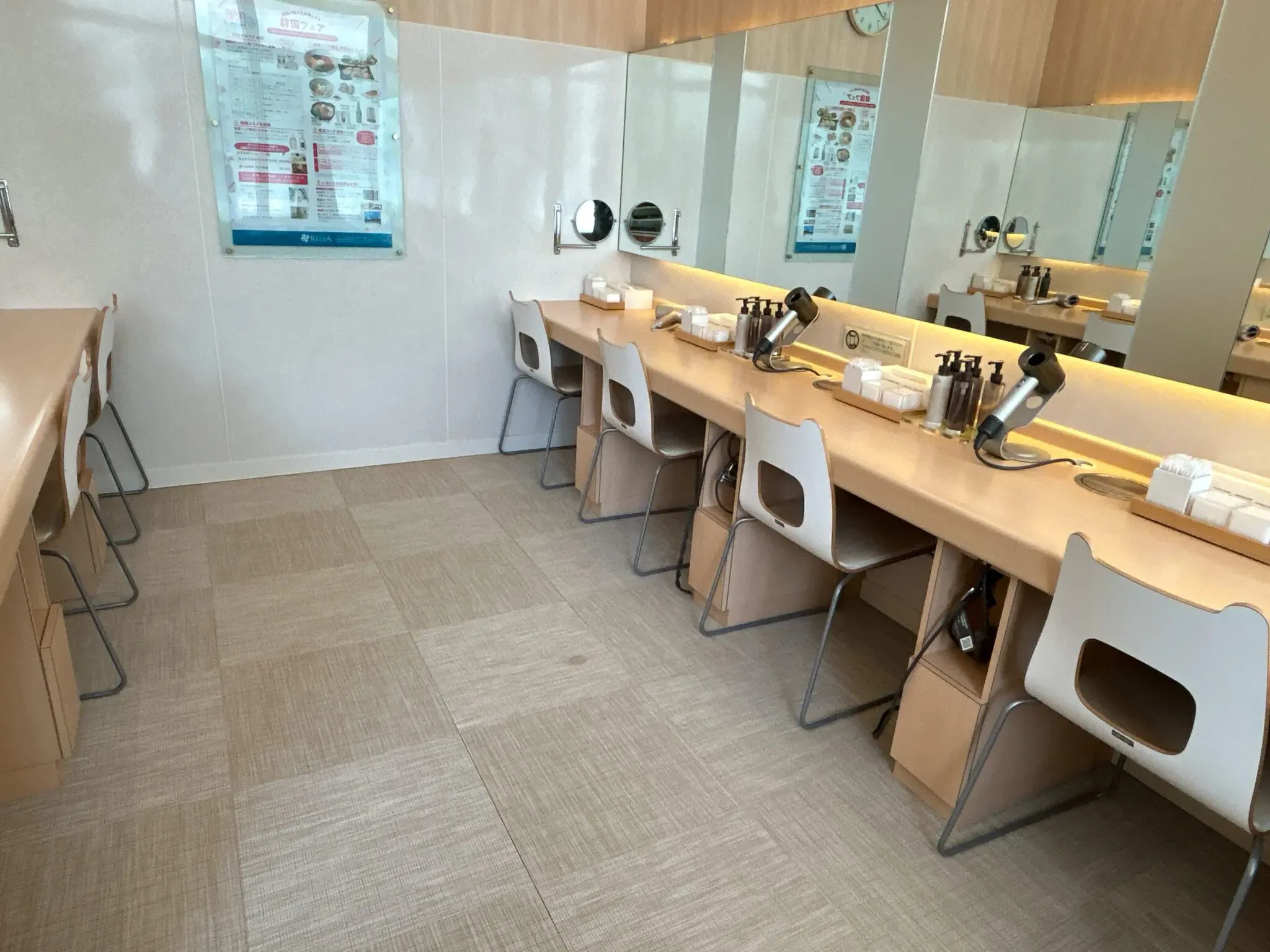 化粧水やティッシュ、綿棒など充実したアメニティが揃うパウダールーム。一通り湯上がりに必要なものは準備されているため、手荷物が軽減できるのも嬉しいポイントです。