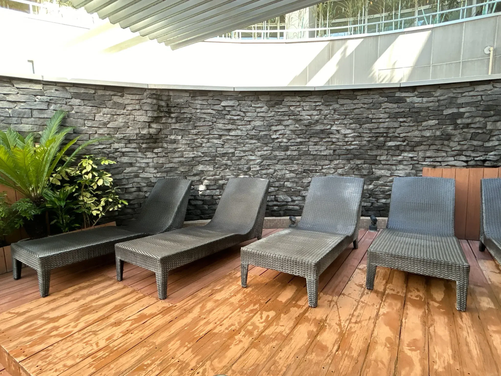 デッキチェアもしっかりと完備。南国ムードの中、至極のととのいができます。