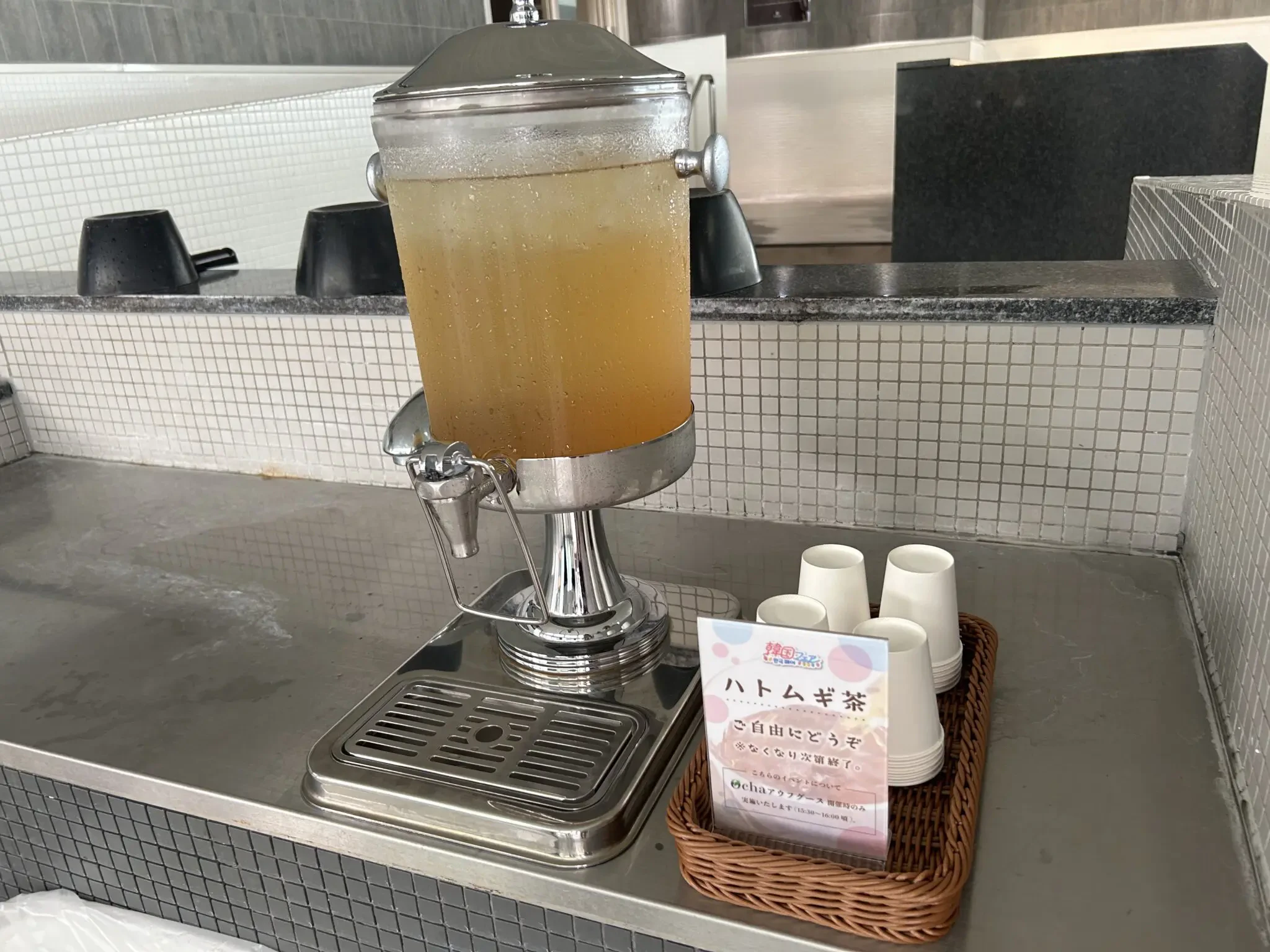 韓国フェア期間中の”お茶アウフグース”開催時のみ、浴室にハトムギ茶が設置されます。キンキンに冷えたハトムギ茶は、火照った体にやさしく染み渡りました。
