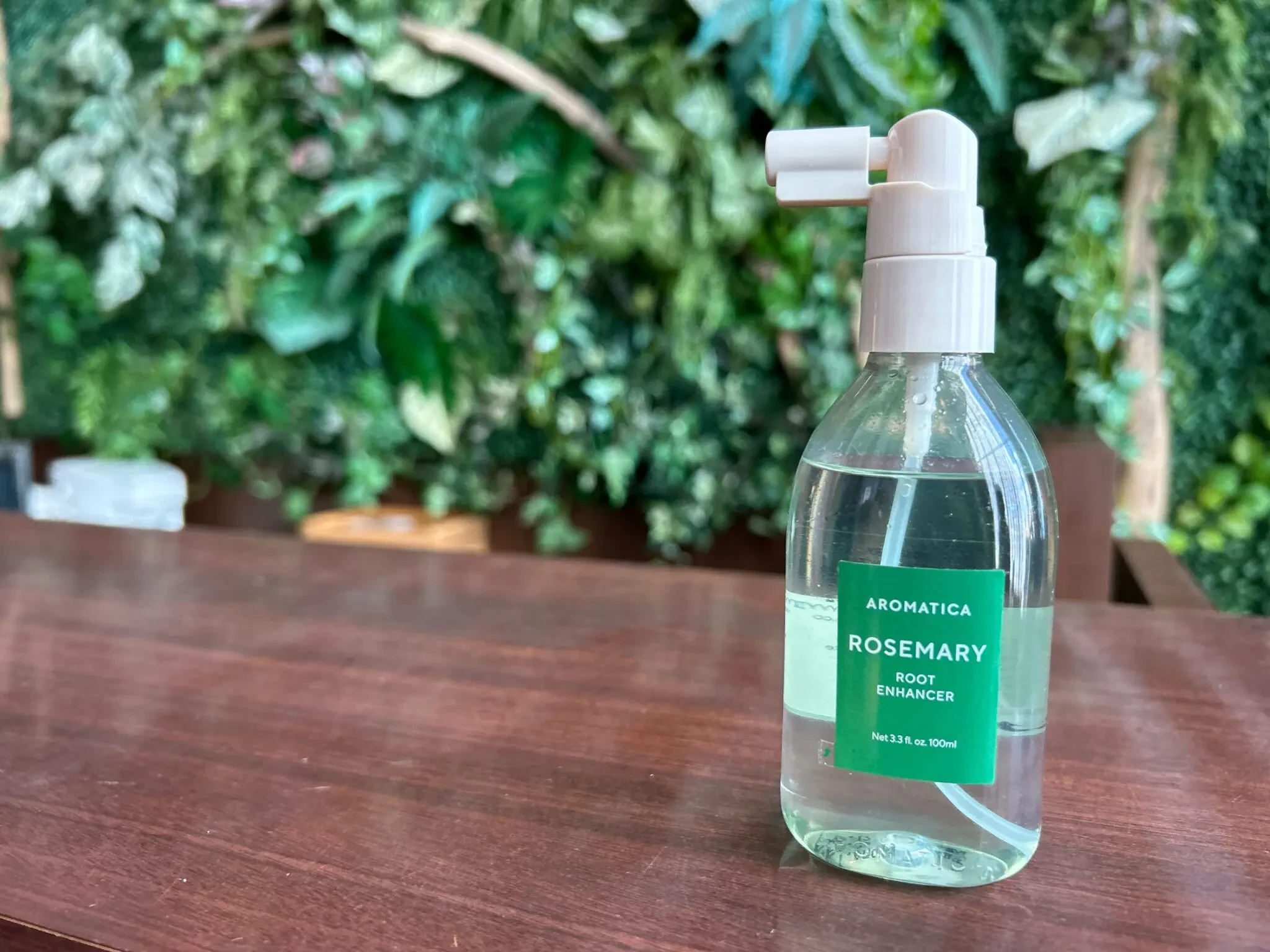 アロマヘッドスパに使用したのは、韓国フェア限定で使用している韓国発のヴィーガンコスメブランドアロマティカの「ルートエンハンサー」。頭皮をやわらかくし、崩れた頭皮バランスを整えてくれるスプレーです。清涼感もあり、頭皮がすっきりします。ローズマリーの香りが心地よく至極のチルタイムができます。