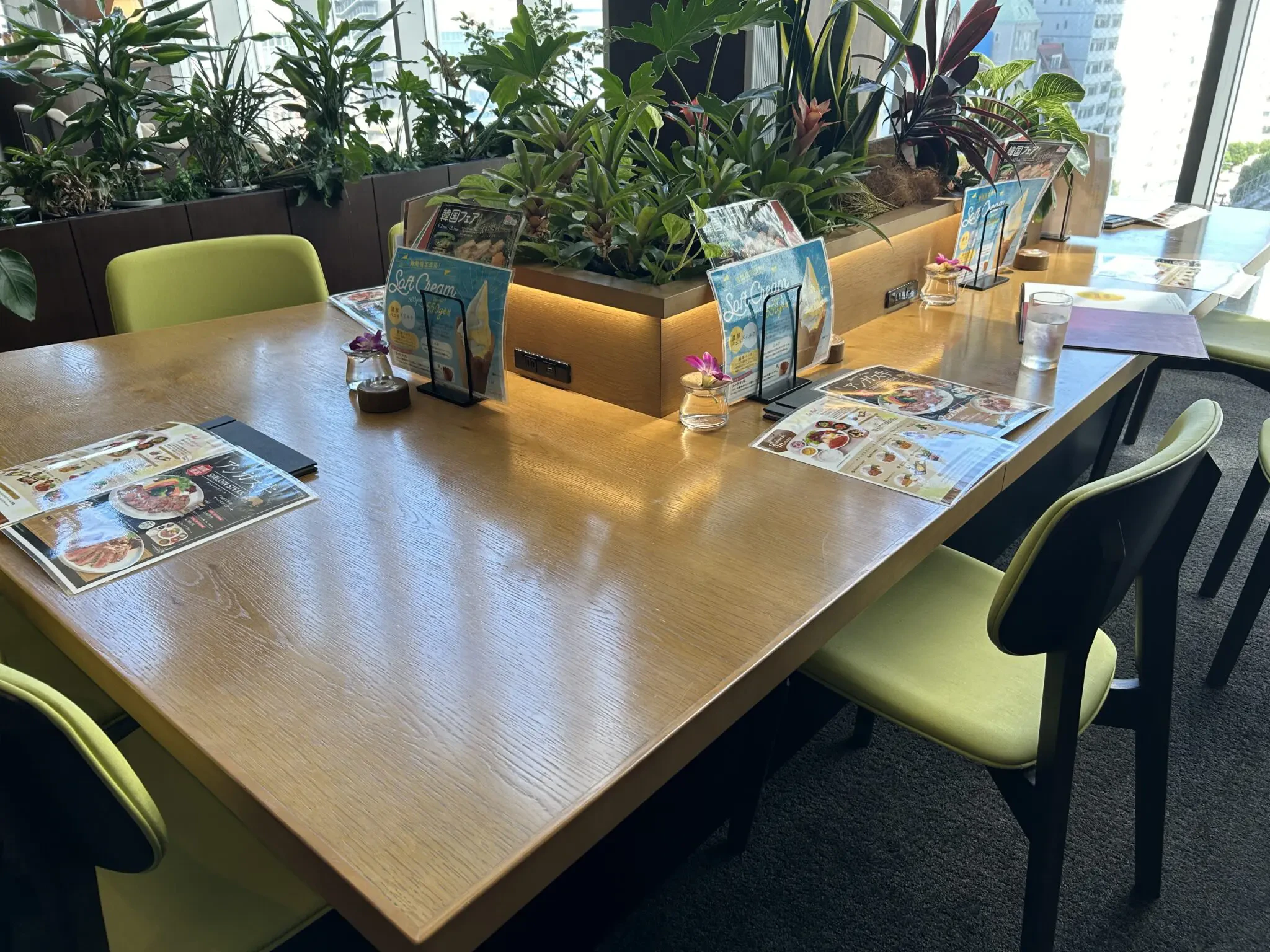 観葉植物に囲まれた席。窓からの景色と観葉植物を眺めながらチルい雰囲気が味わえます。