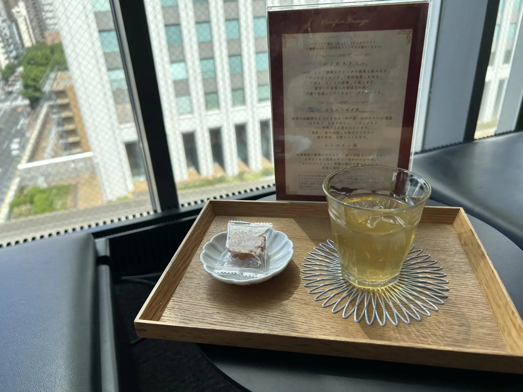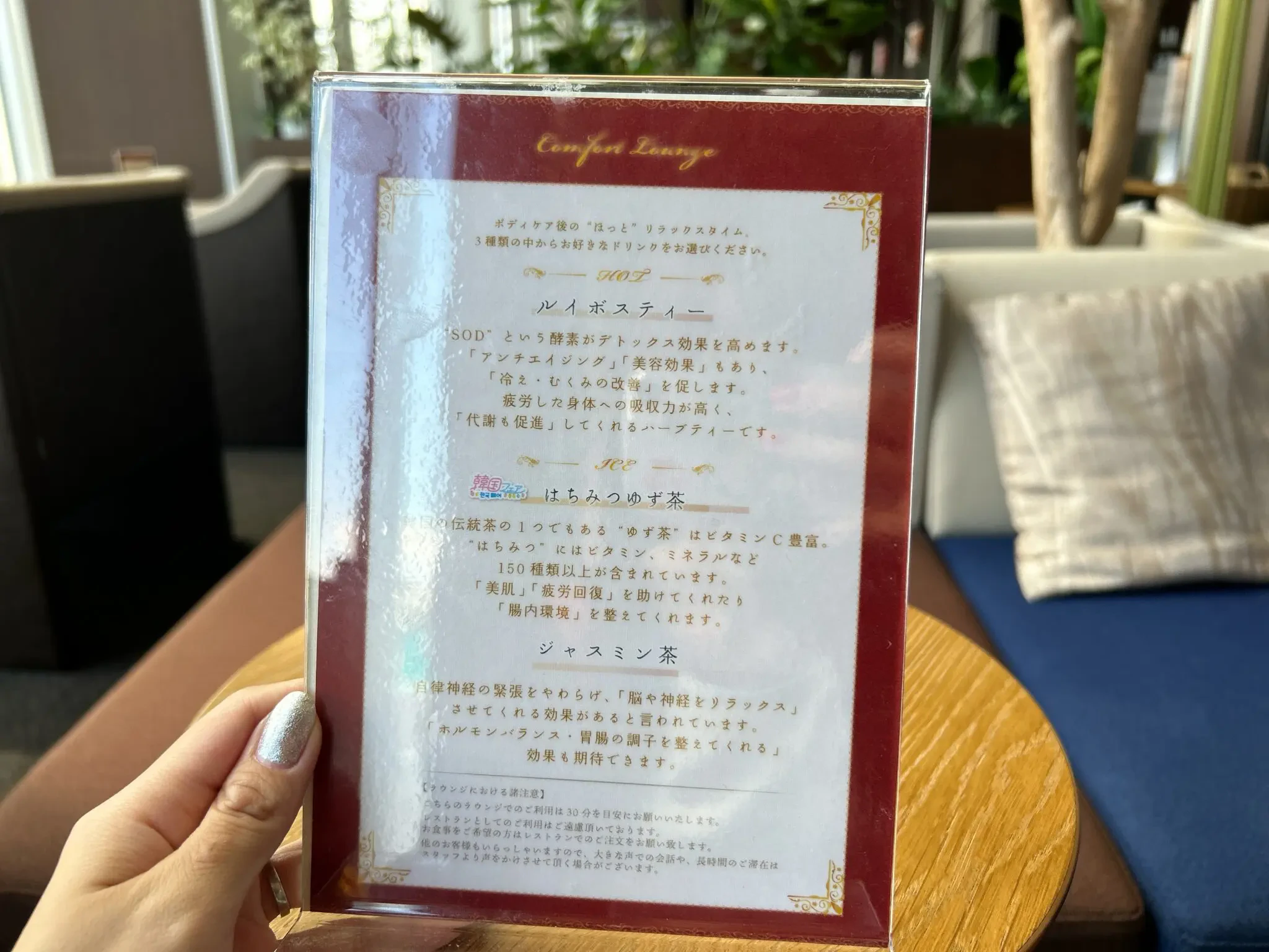 心身ともにすっきりしたあとは、ラウンジでドリンクサービスが受けられます。観葉植物がたくさん置かれたラウンジは居心地も抜群です!好きな席に座ってチルタイムが過ごせます。