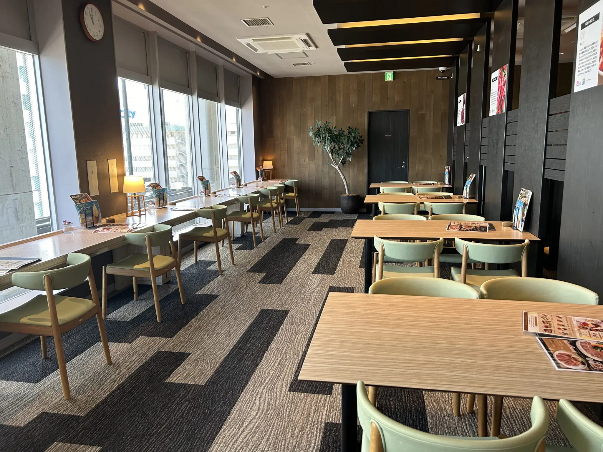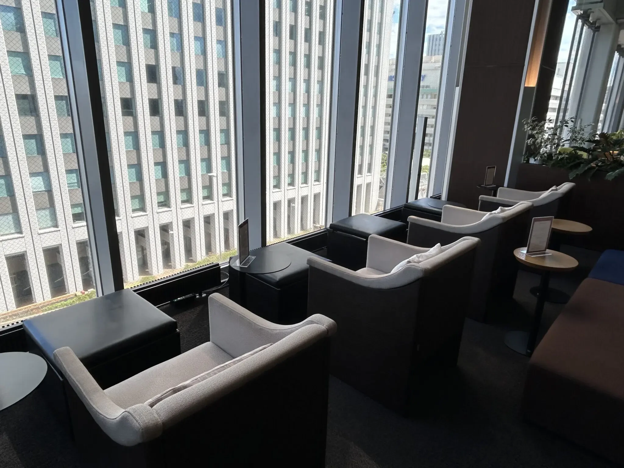 外を眺めながらチルできる席。高層ビルなど都心の景色を一望できます。